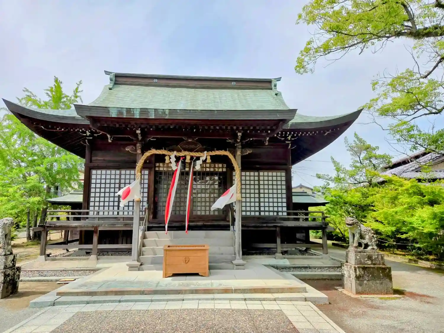 <拝殿>全景。銅板葺屋根と木製の躯体でオーソドックスな見た目だが、よくよく見ると正面にサッシが入っていたりして割と新しいものみたい。
