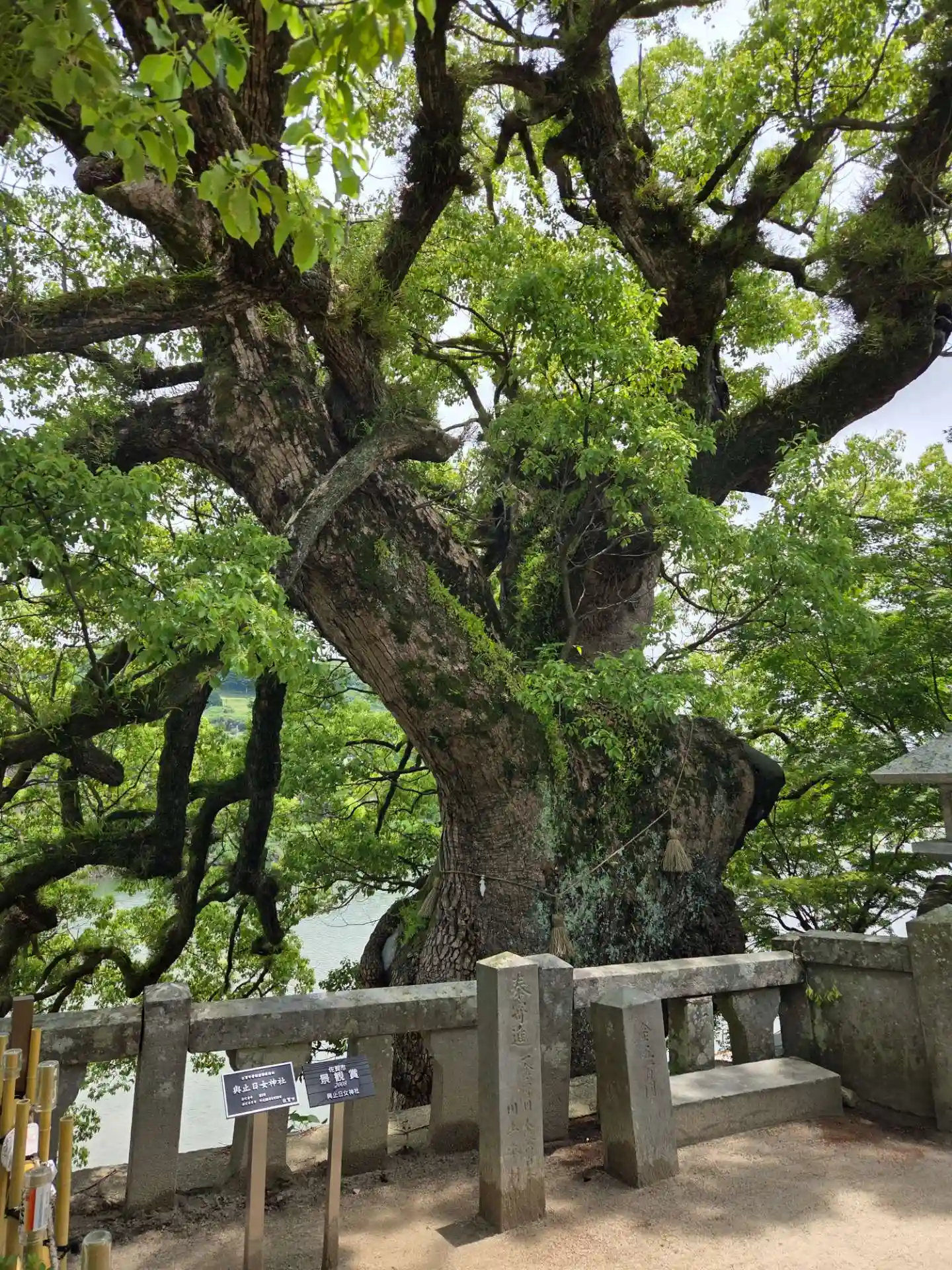 拝殿、神饌所の左手にある<大楠>。鍋島初代藩主勝茂が国の霊木として石垣を築き保護した。高さ30m、幹回り27mあったが、1813年に落雷により火災。