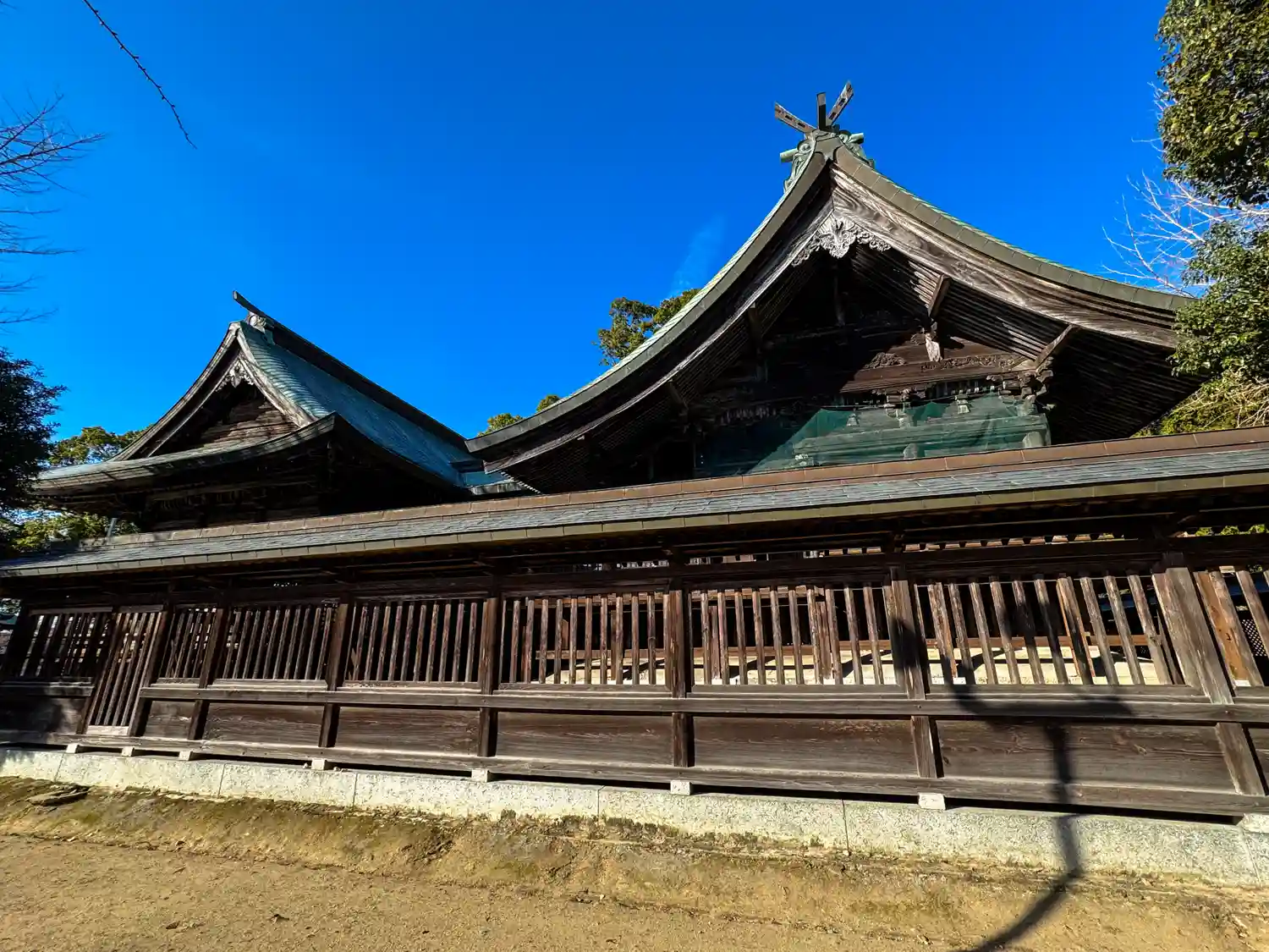 社務所から見た<社殿>全景。古社らしい趣と重厚感がある。