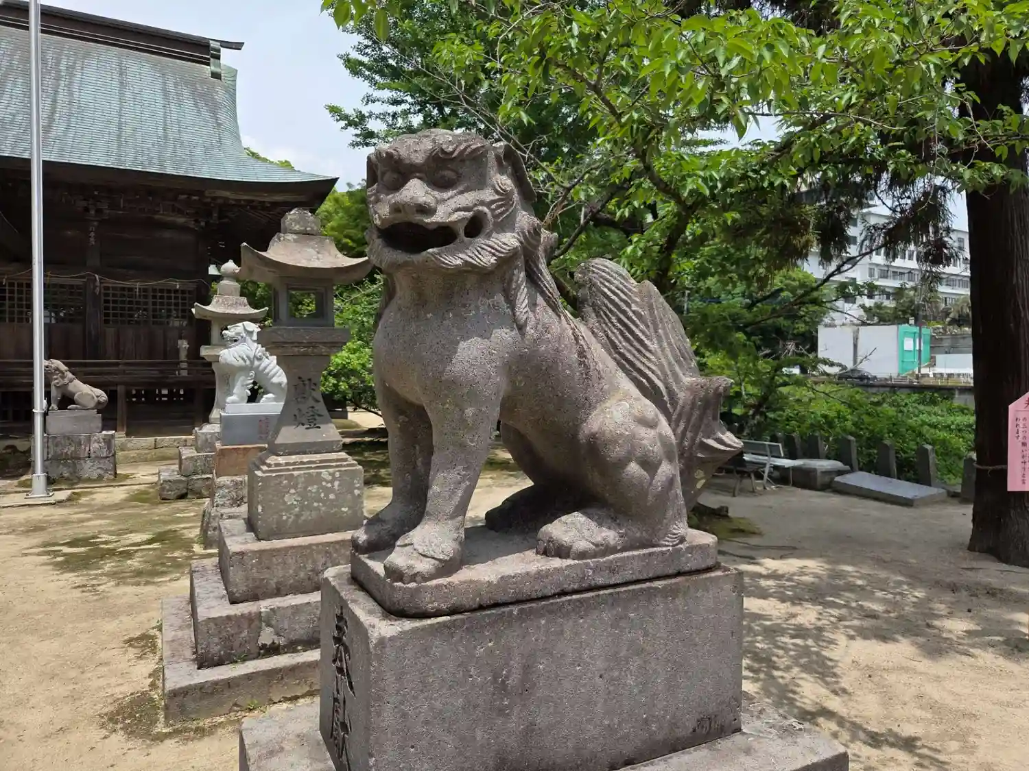 平成二十六年(2014)千四百五十年大祭記念奉納の狛犬 台座は古く、以前は江戸期の狛犬が座っていました