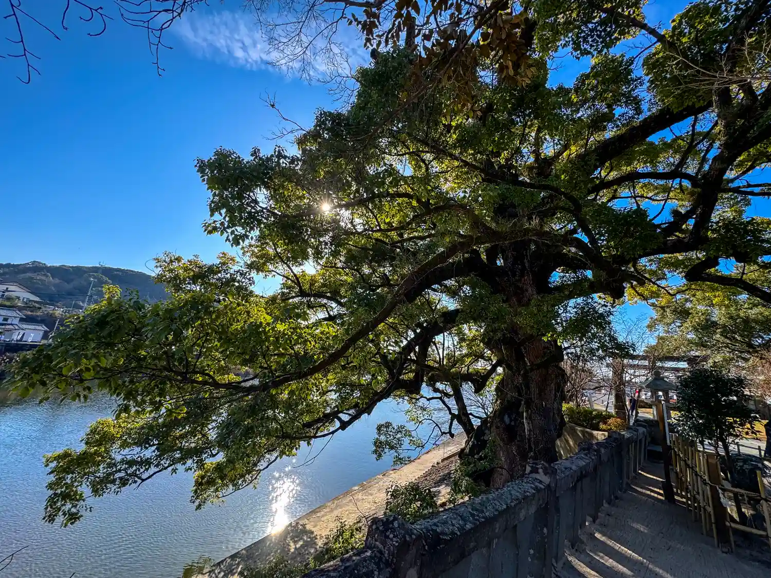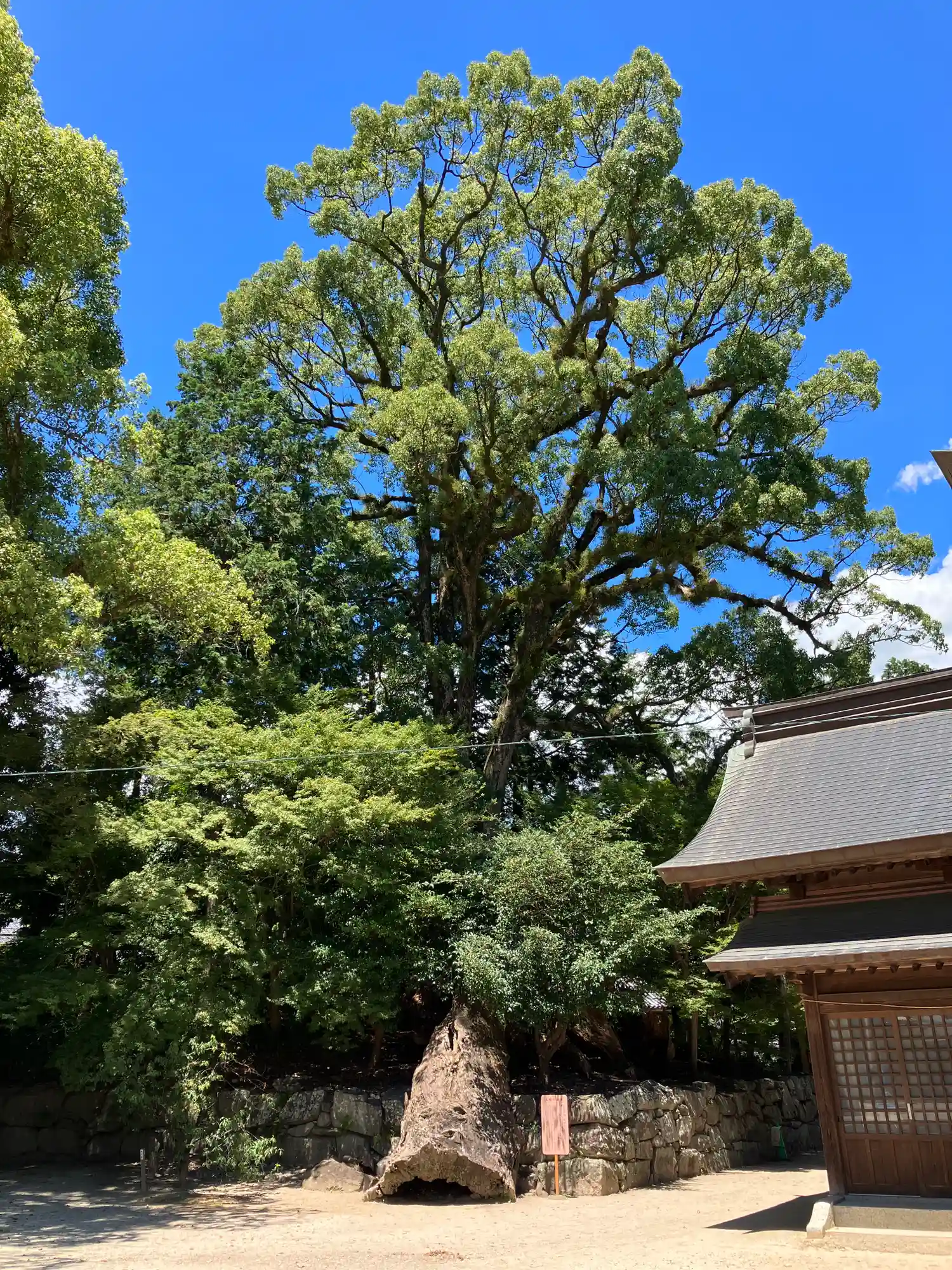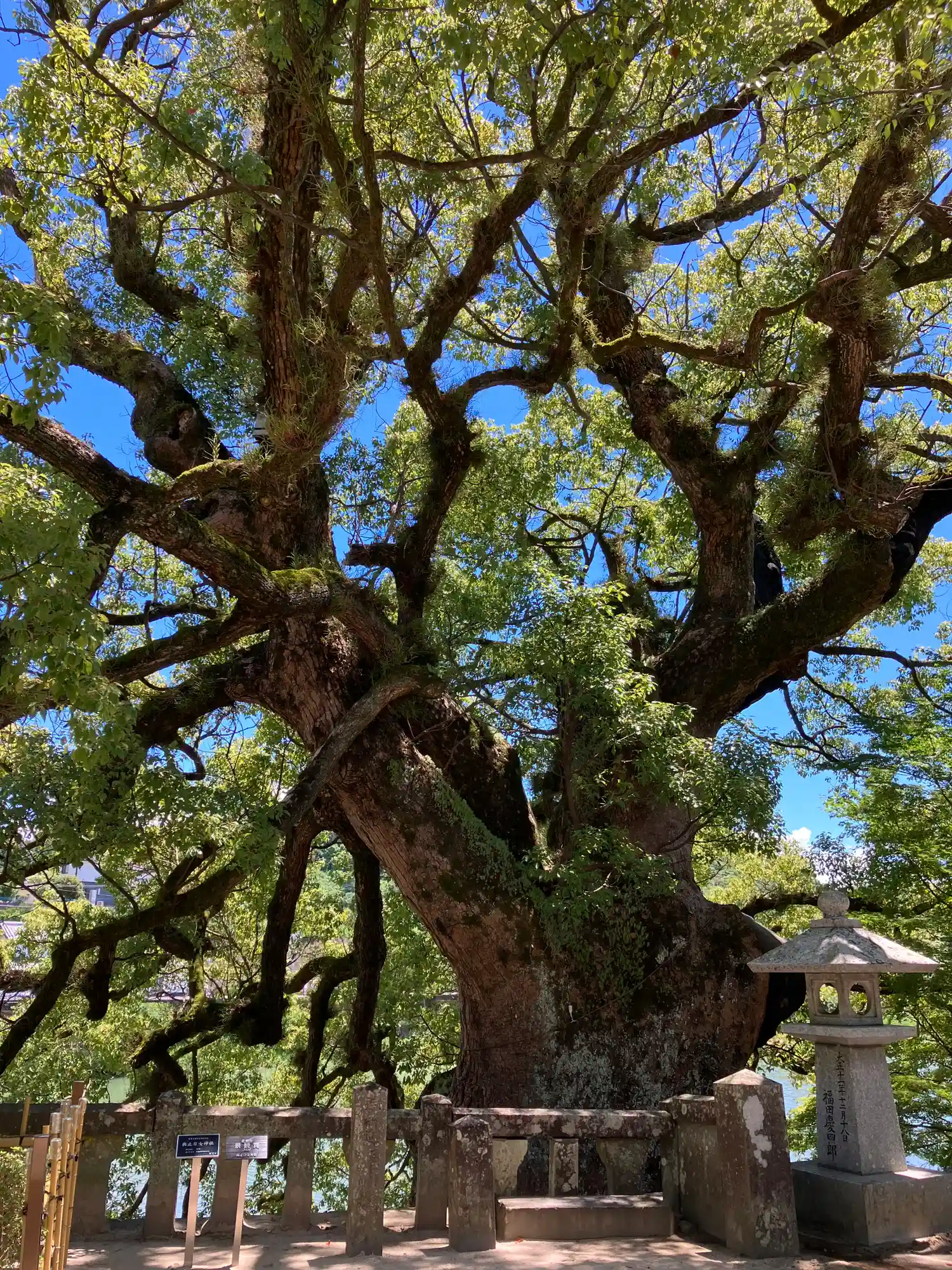 幹回り27メートルの大楠がご神木だったとか。1813年の落雷で焼失も根…