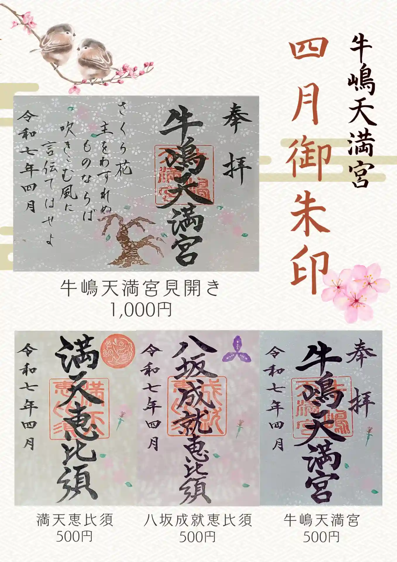 4月の御朱印、見開き御朱印は道真公が詠まれた「桜花」と枝下桜を飾りました。