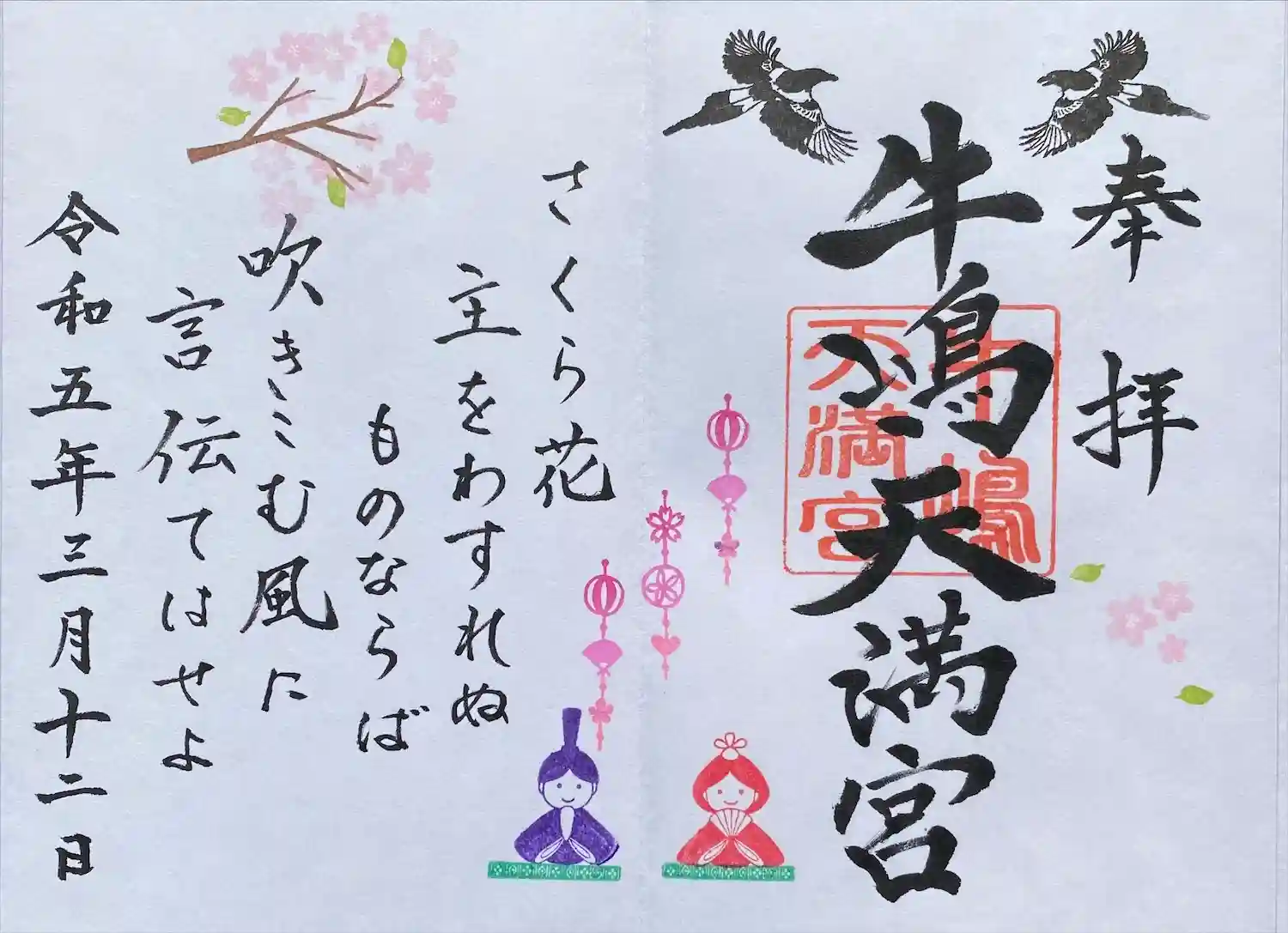 3月の見開き御朱印は「道真公が詠まれた和歌~さくら花 主をわすれぬものならば・・・」と桜と雛人形を飾りました。