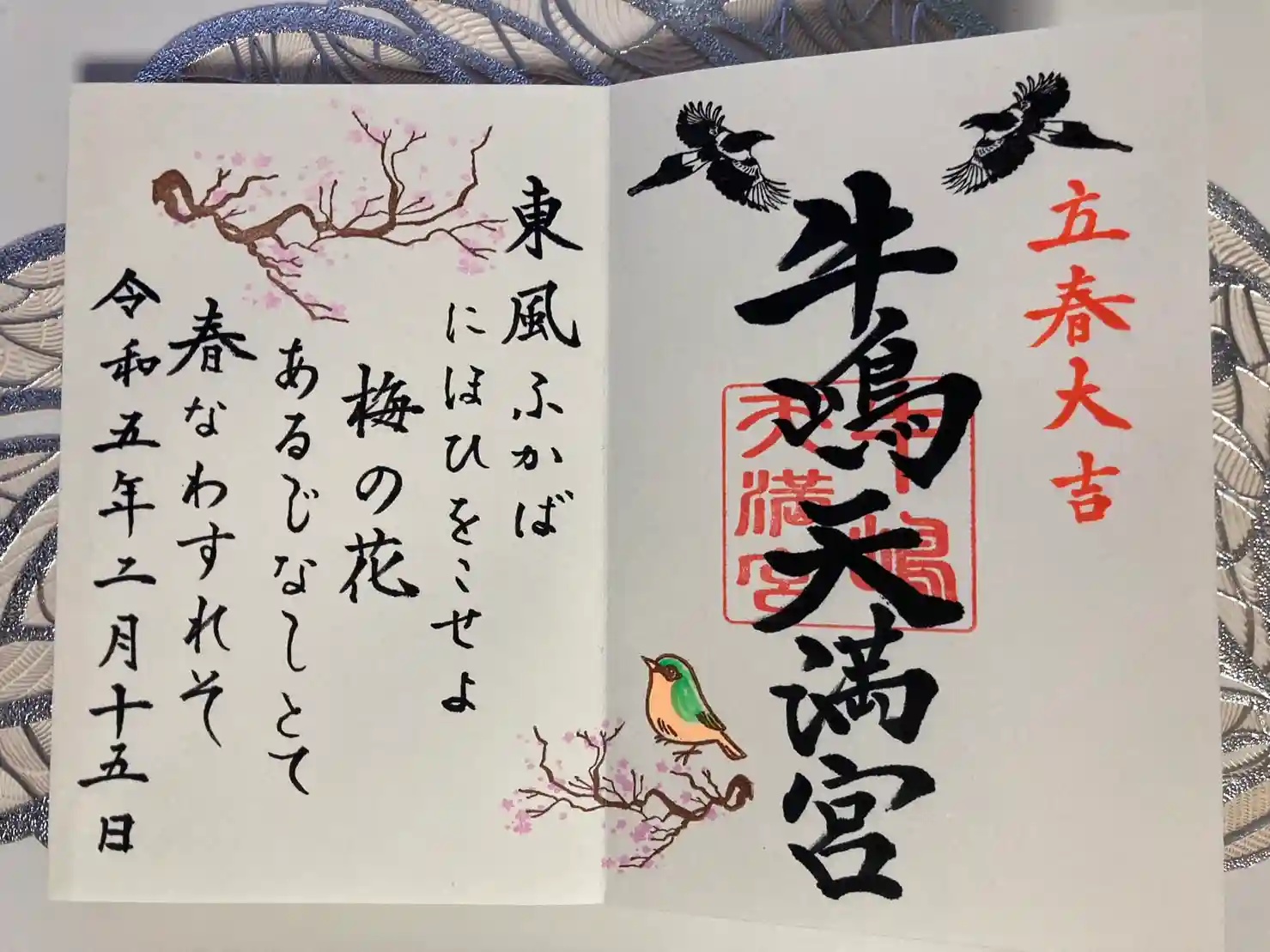 2月の見開き御朱印は「道真公が詠まれた和歌~東風ふかば・・・」と梅とウグイスを飾りました。