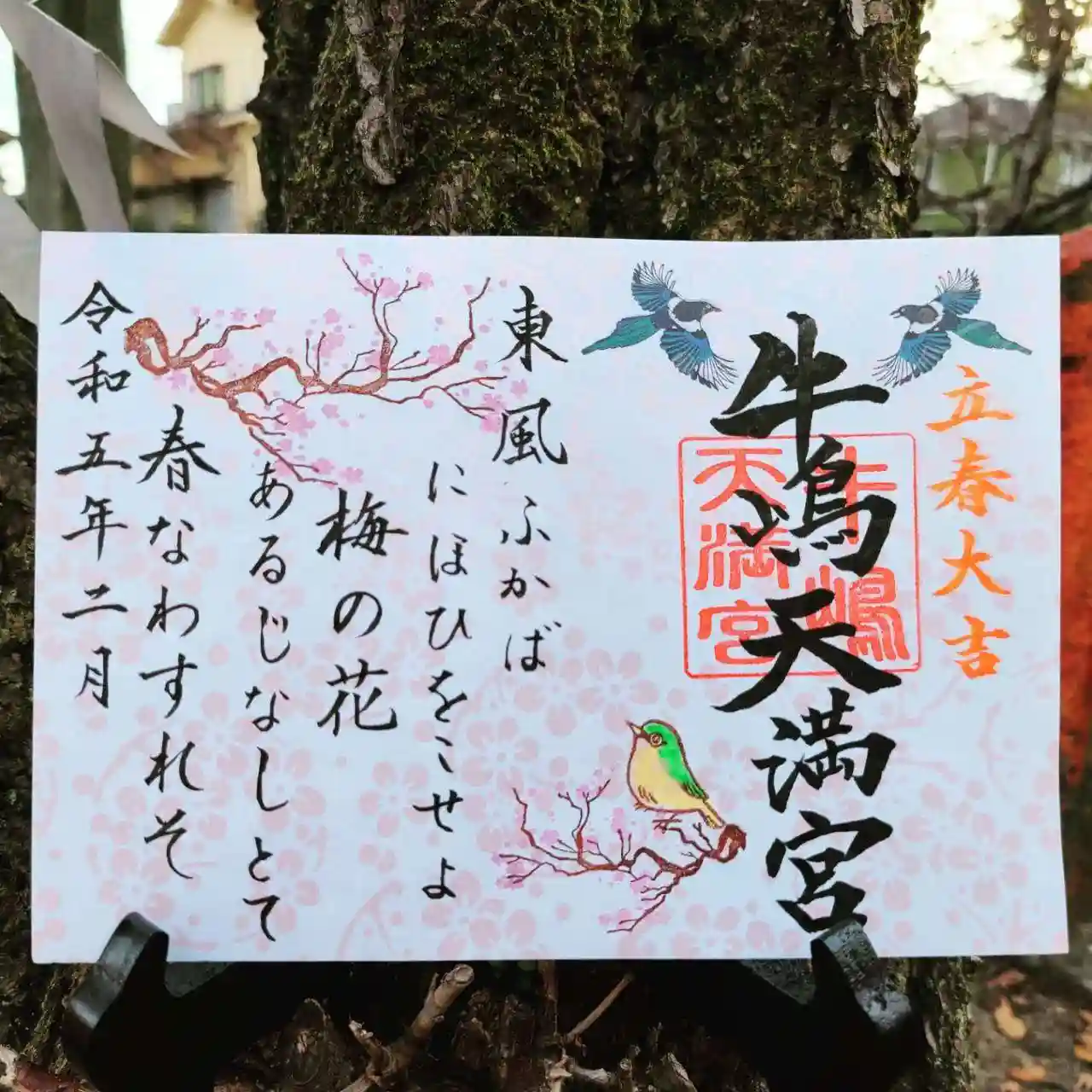 牛嶋天満宮2月の御朱印は、厄除けのおまじない「立春大吉」と梅とウグイスを飾りました。