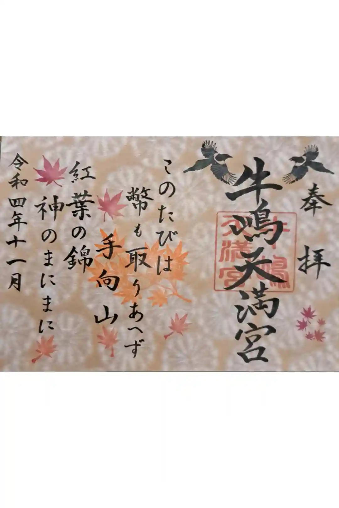 見開き御朱印には、道真公が詠まれ古今和歌集に掲載されている「紅葉の錦」を謹書しております。