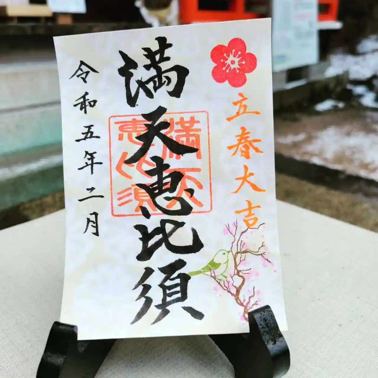 満天恵比須さま2月の御朱印は、厄除けのおまじない「立春大吉」と梅とウグイスを飾りました。