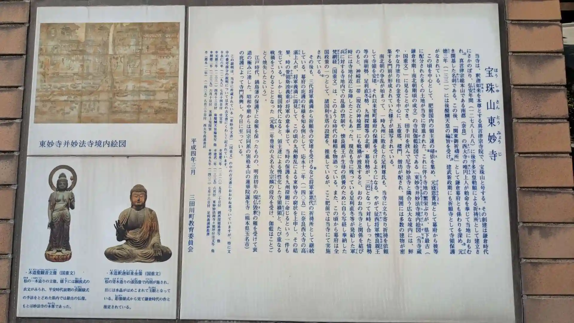 吉野ヶ里遺跡へ向かう途中で立ち寄りました。正面から参拝する際は目の前に長崎本線の線路が通っているので地下通路を通って向かいます。後宇多天皇の勅願寺で元寇において蒙古掃討と降伏退散を祈願して建てられました。昔はもっと大きなお寺で戦国時代の騒乱や明治時代の廃仏毀釈で被害を受けながらも現在まで貴重な文化財を受け継いできたお寺です。本堂内には東妙寺古図などの文化財が博物館の様に展示され間近で見ることもできます。