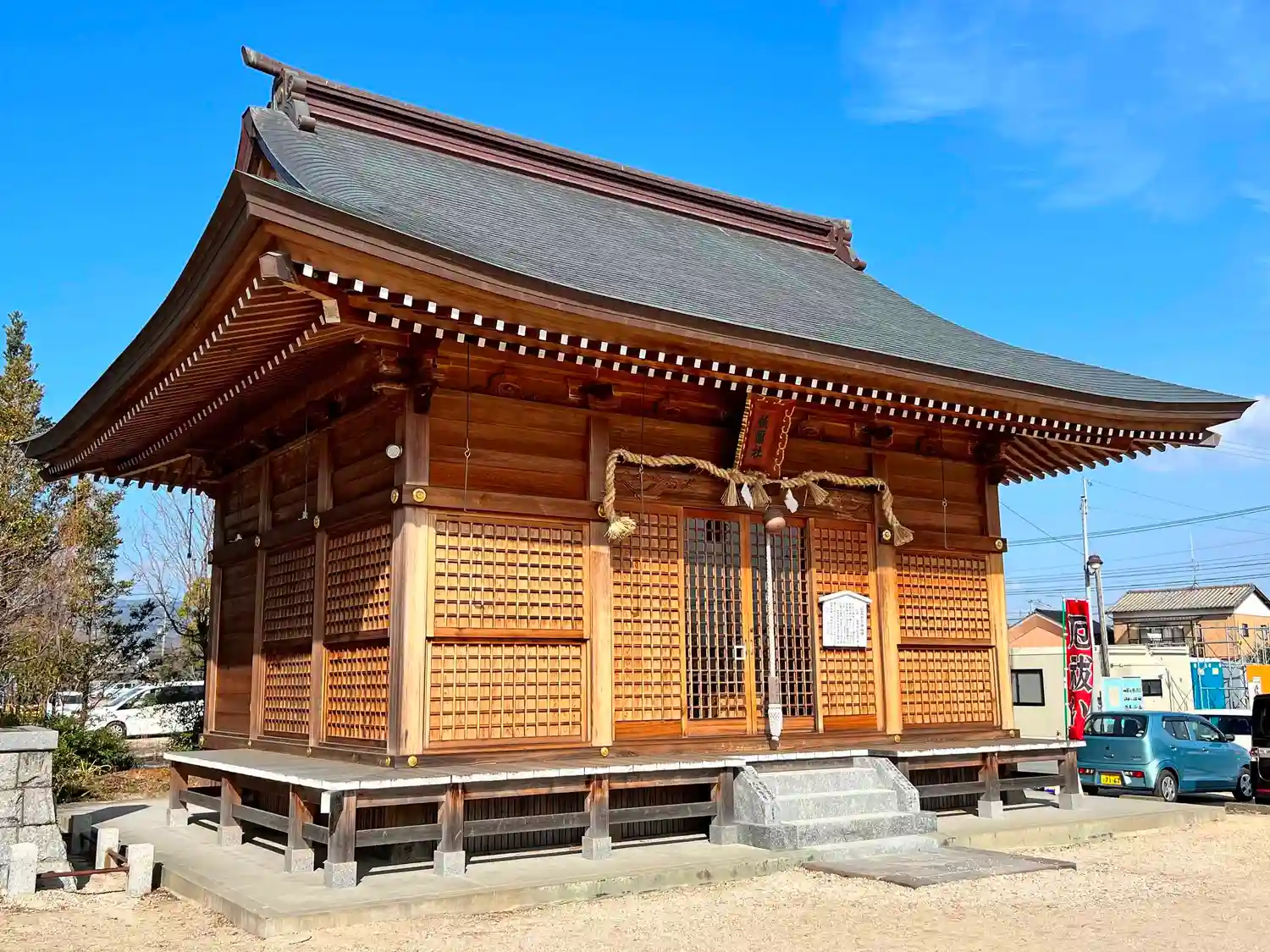 相撲土俵の北側に建つ<祇園社>。まだ建てて間もない感じ。