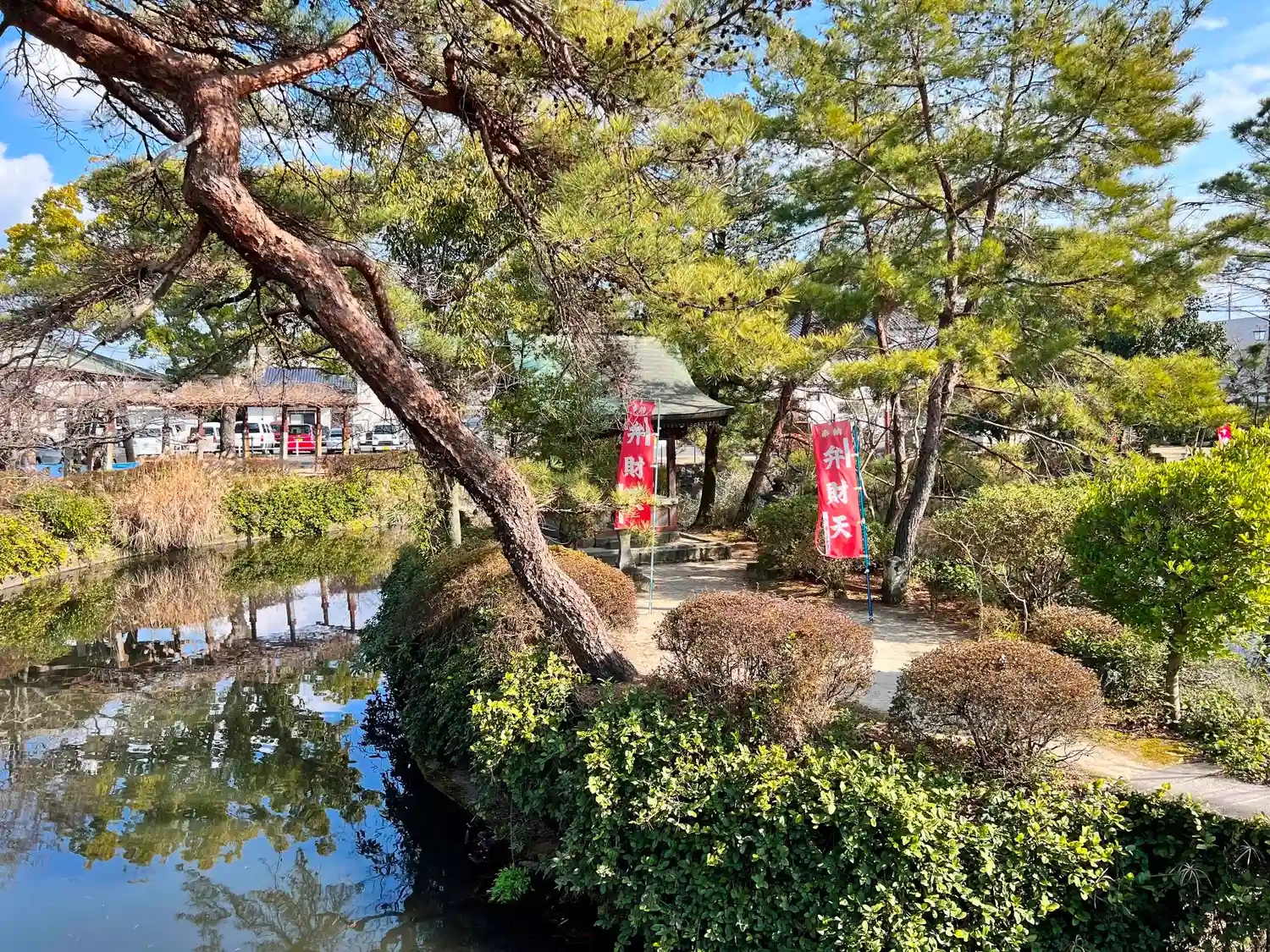 参道右側には大きな<琴の池>が広がり、その中央の小島には<弁財天社>がある。