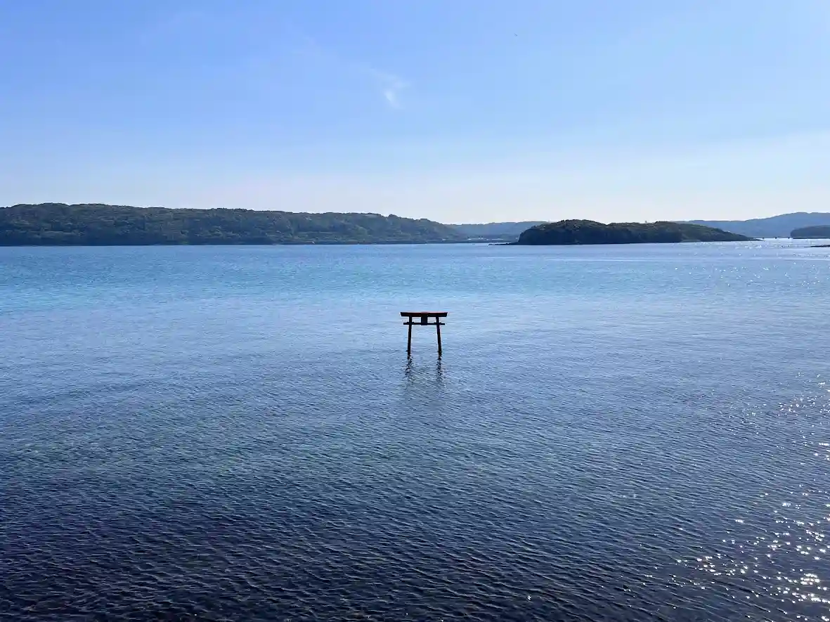 沖合に小さい海中鳥居があります。