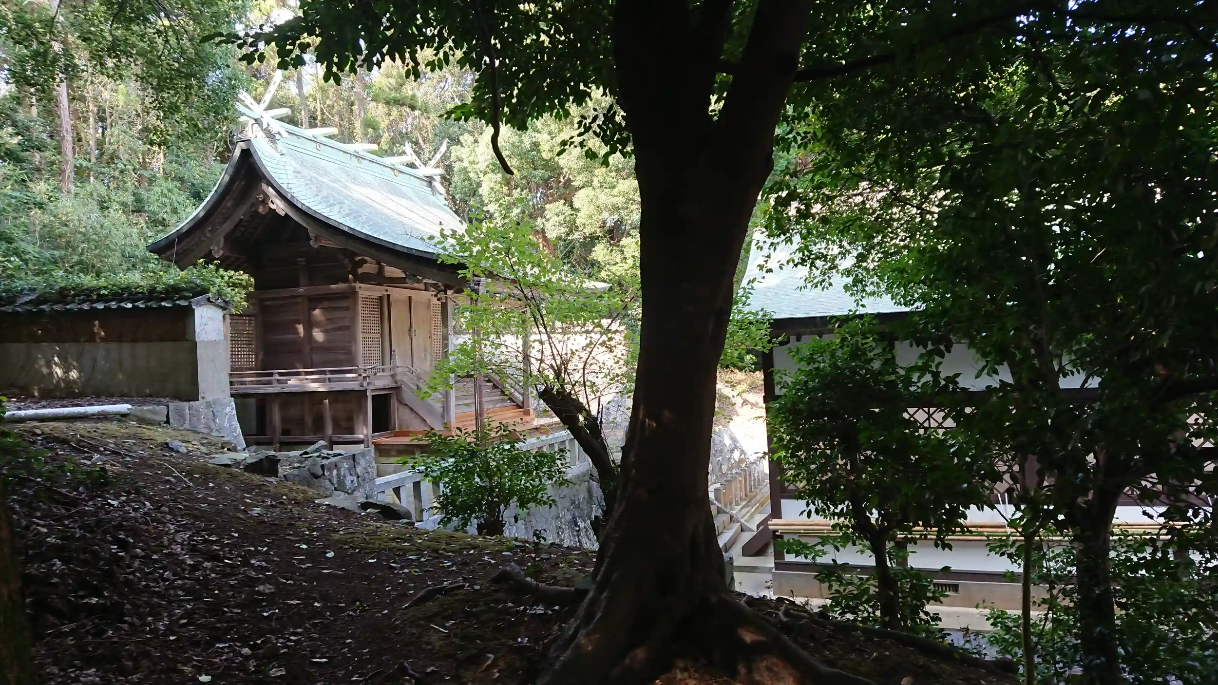 境内左手、小高い所から見た拝殿、本殿。