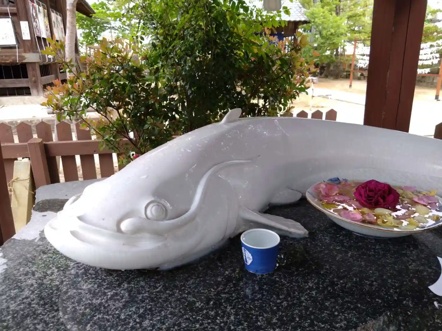 境内の白なまず様に触れると美肌のご利益があるとのこと…