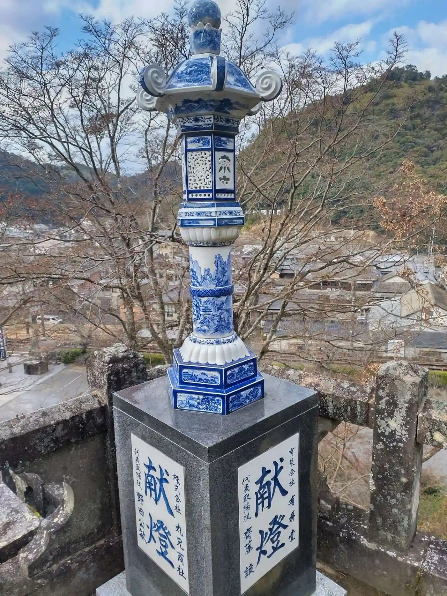 有田は陶器の町で、この神社に祖先が祀られています!ですので、鳥居や狛犬、灯籠、手すりなどが陶器で作られています(*^^*)また、駐車場から最初の階段を登るとすぐ踏切があり、定時に電車が通過します!写真映えはしますが遮断機がないので気をつけてください(^^;現在はマリオのラッピング電車が通っていました!