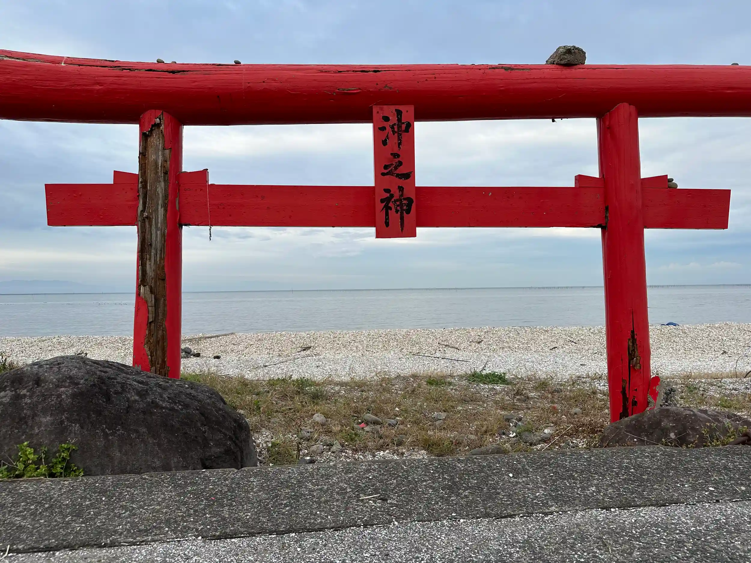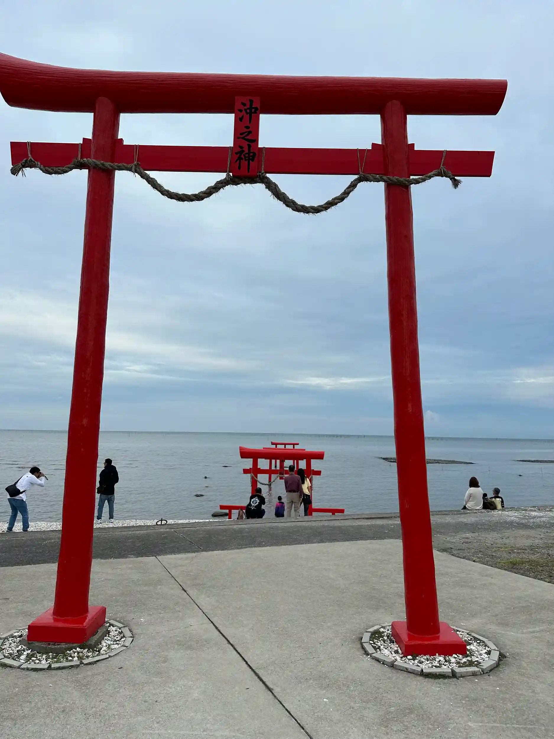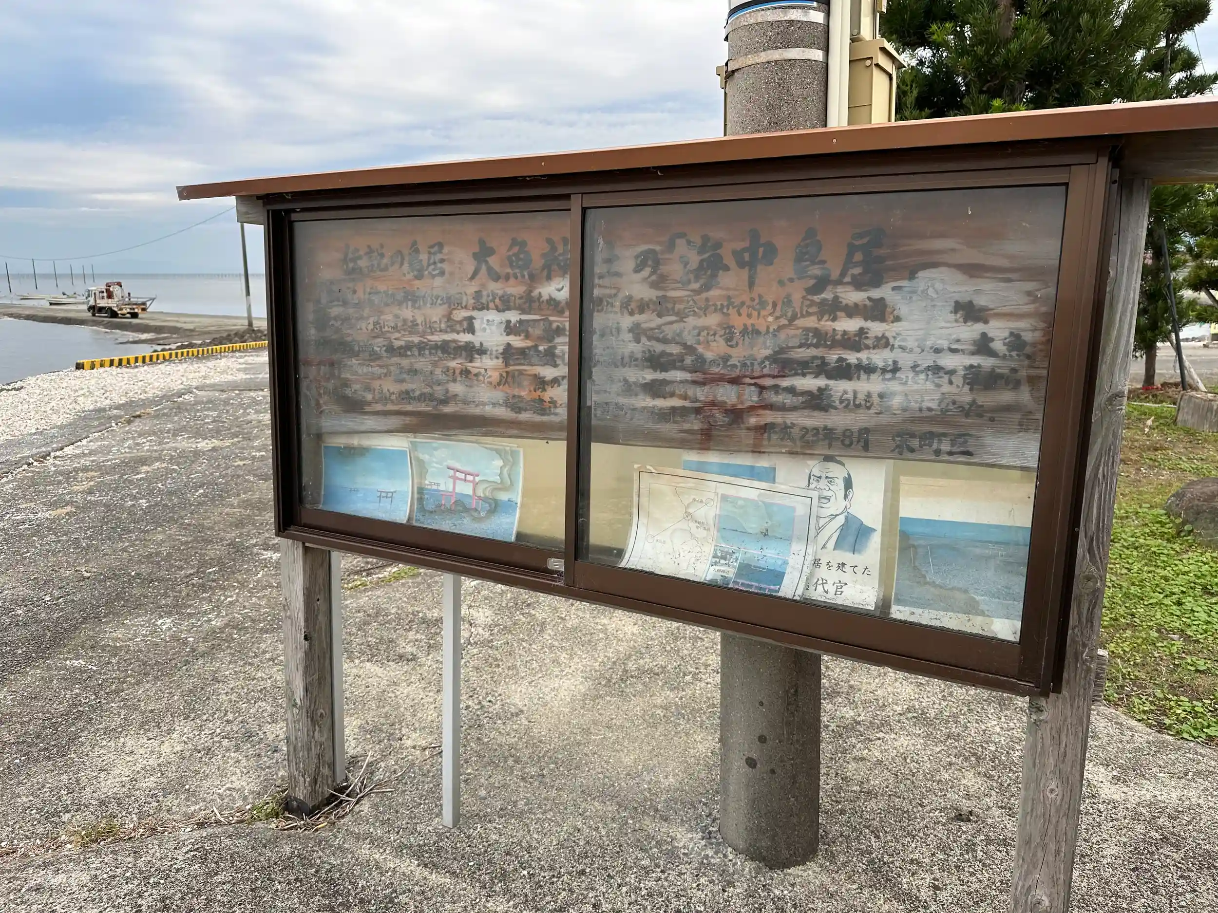 太良町栄町の有明海には3基の海中鳥居があります。約300年前(1693年頃)島に置き去りにされた代官が大魚(ナミノウオ)に救われ、 感激した代官は魚の名を取って「大魚神社」を建て、岸から約2丁(約200メートル)の海中に鳥居も建てたといわれています。この鳥居は沖ノ島との間の鳥居であり、30年毎に建立する習わしが今も伝えられています