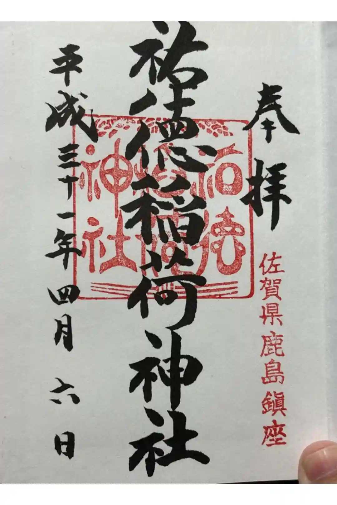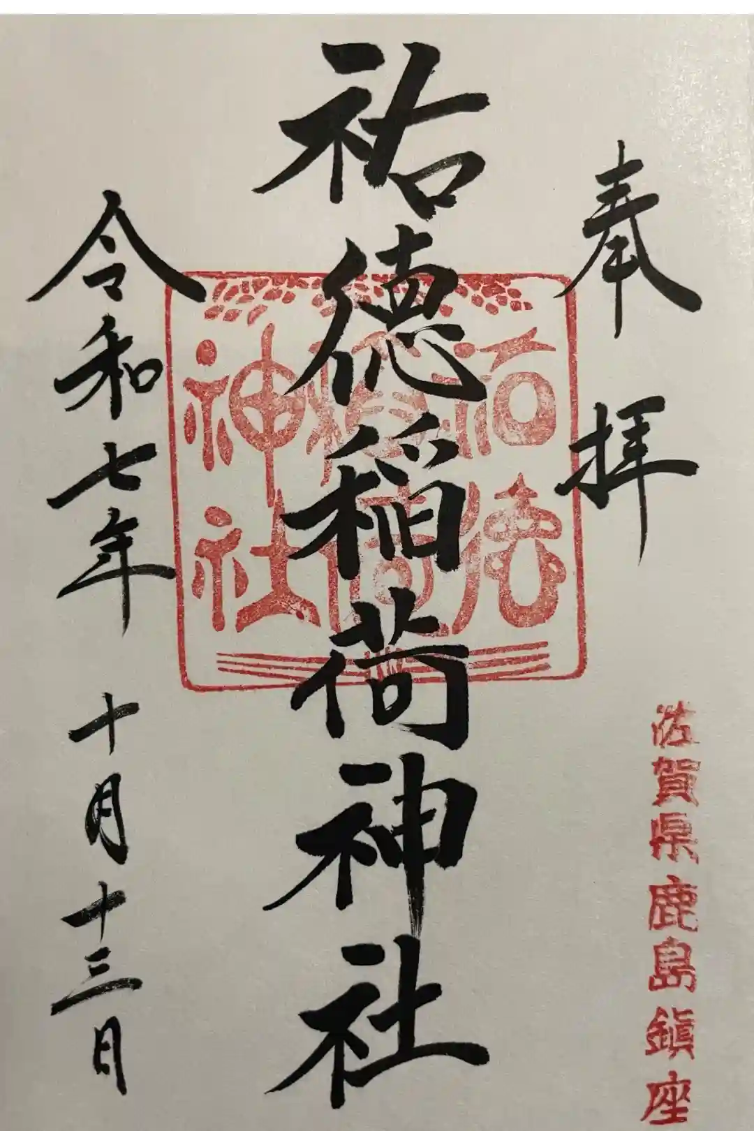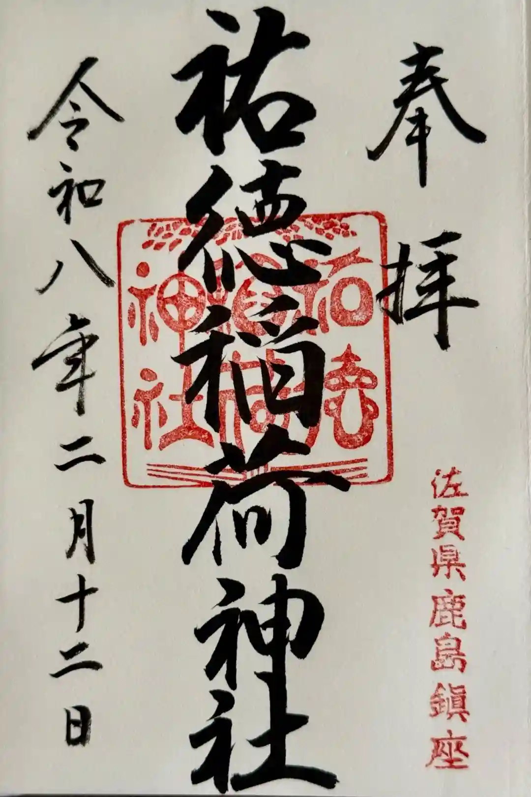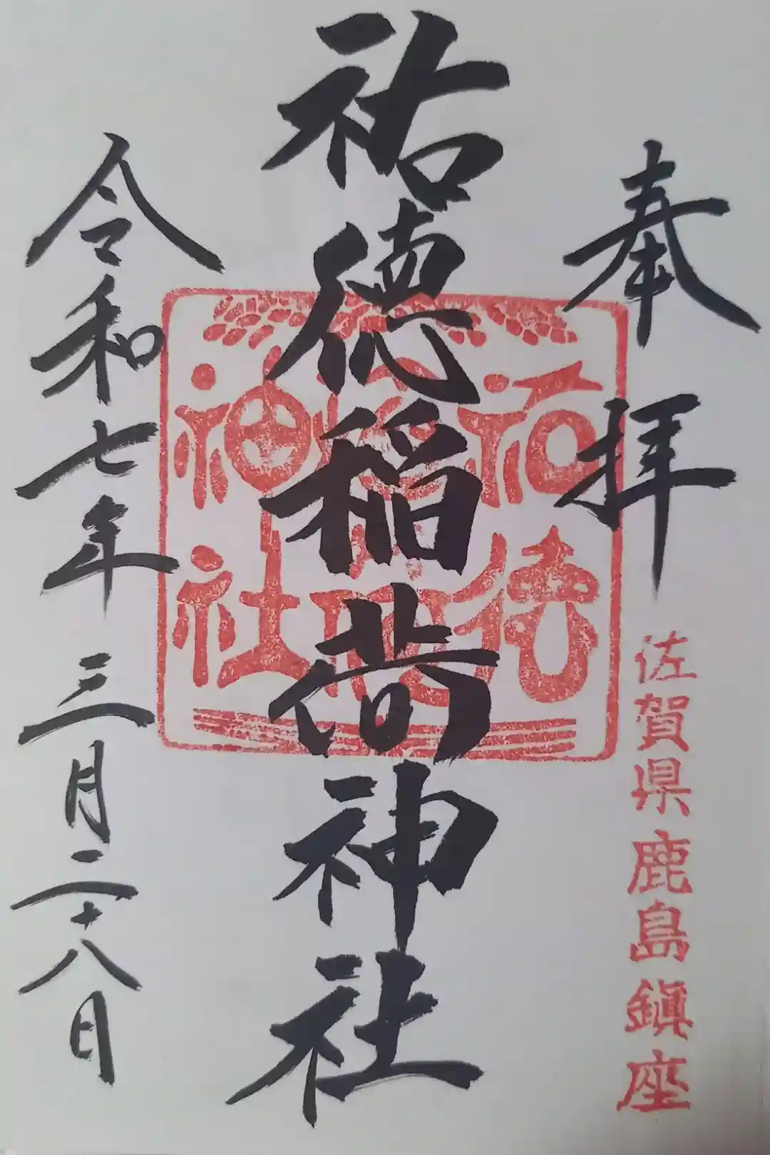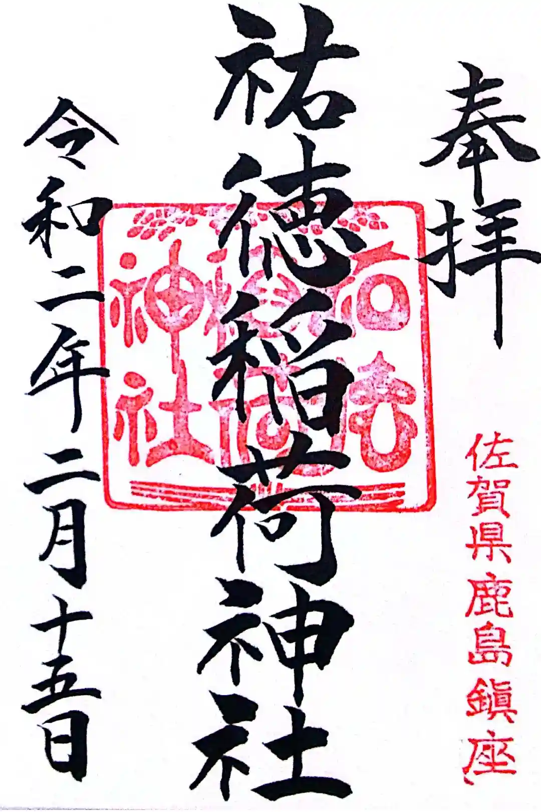 真ん中に祐徳稲荷神社と書かれ、右下に佐賀県鹿島鎮座の印、真ん中に祐徳稲荷神社の印が押されています。