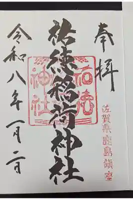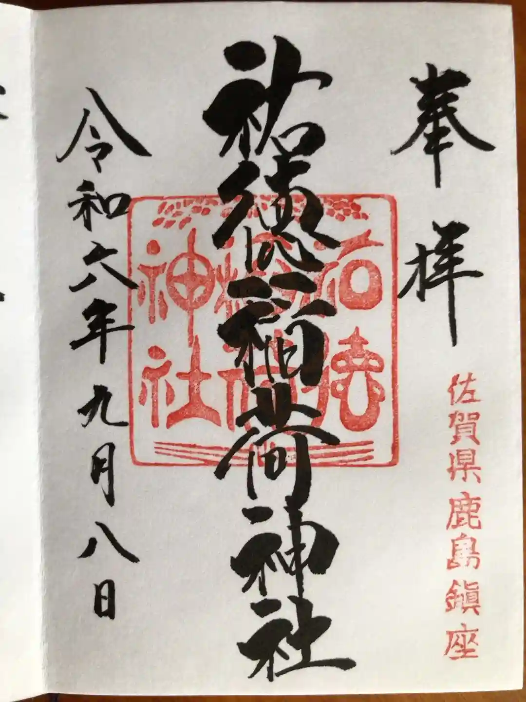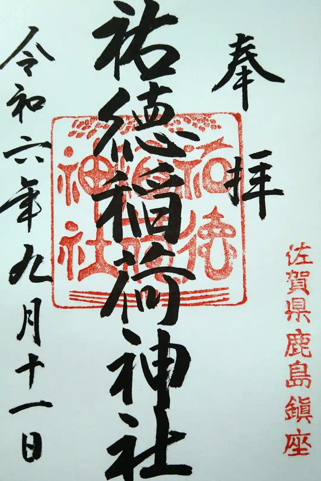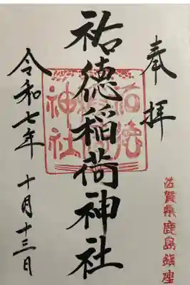 真ん中に祐徳稲荷神社と書かれ、社印、右下に佐賀県鹿嶋鎮座の印が押されています。