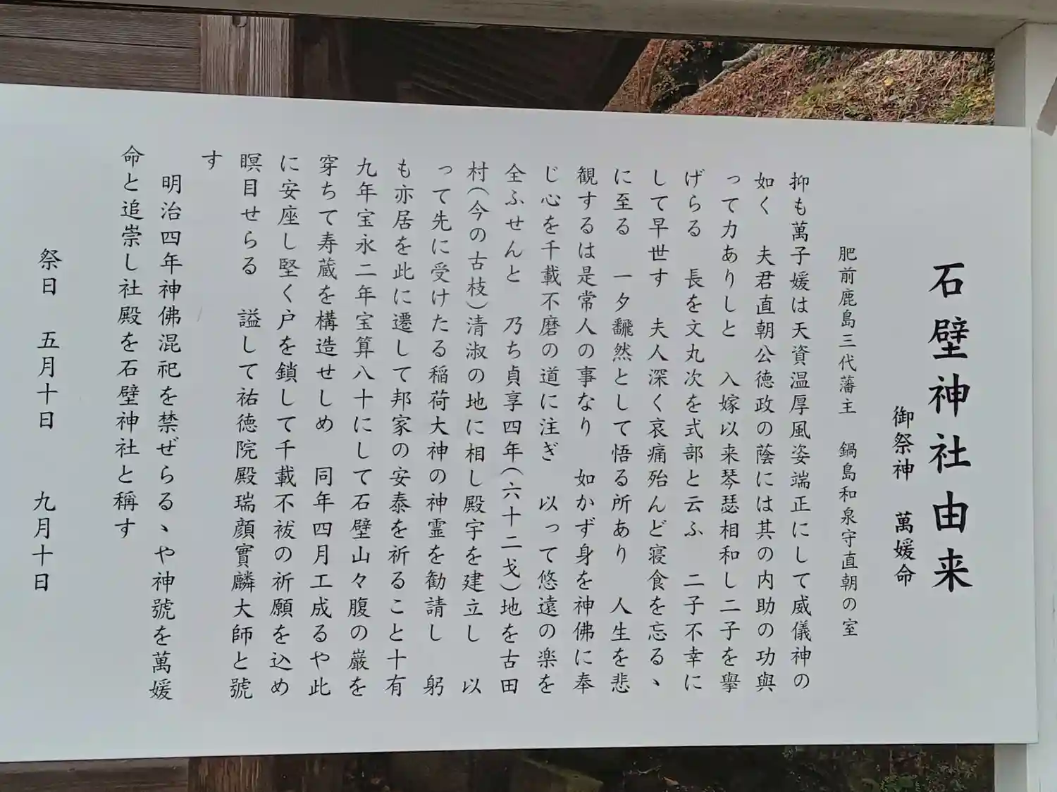 貞享4年(1687)創建。鹿島藩主鍋島直朝の夫人・花山院萬子姫が京都から輿入れする際、京都御所内の…
