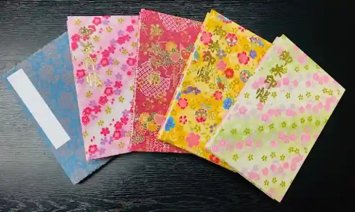 表に「ちりめん生地」が貼ってある可愛らしい御朱印帳。女性にすごく人気です。