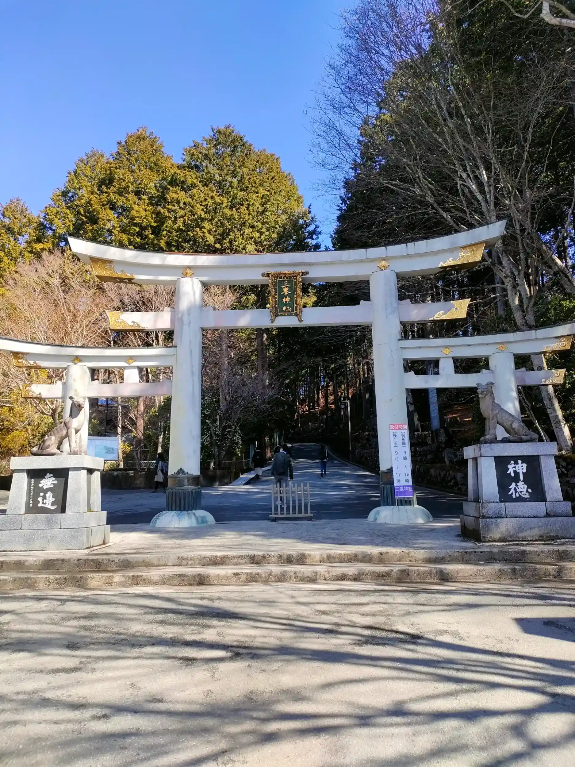 埼玉県秩父市の三峰神社!三ツ鳥居という変わった鳥居、狛犬ではなく狼の像が鎮座。2本の御神木が圧巻!とても静かで自然のパワー(氣)を感じられます。石畳に浮かび上がった龍は運気上昇すると言われています。