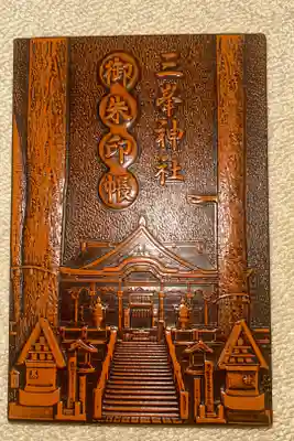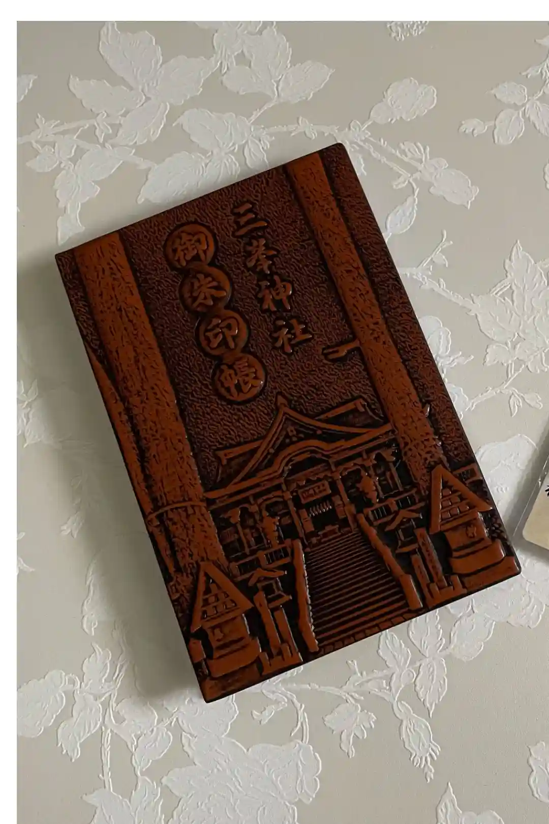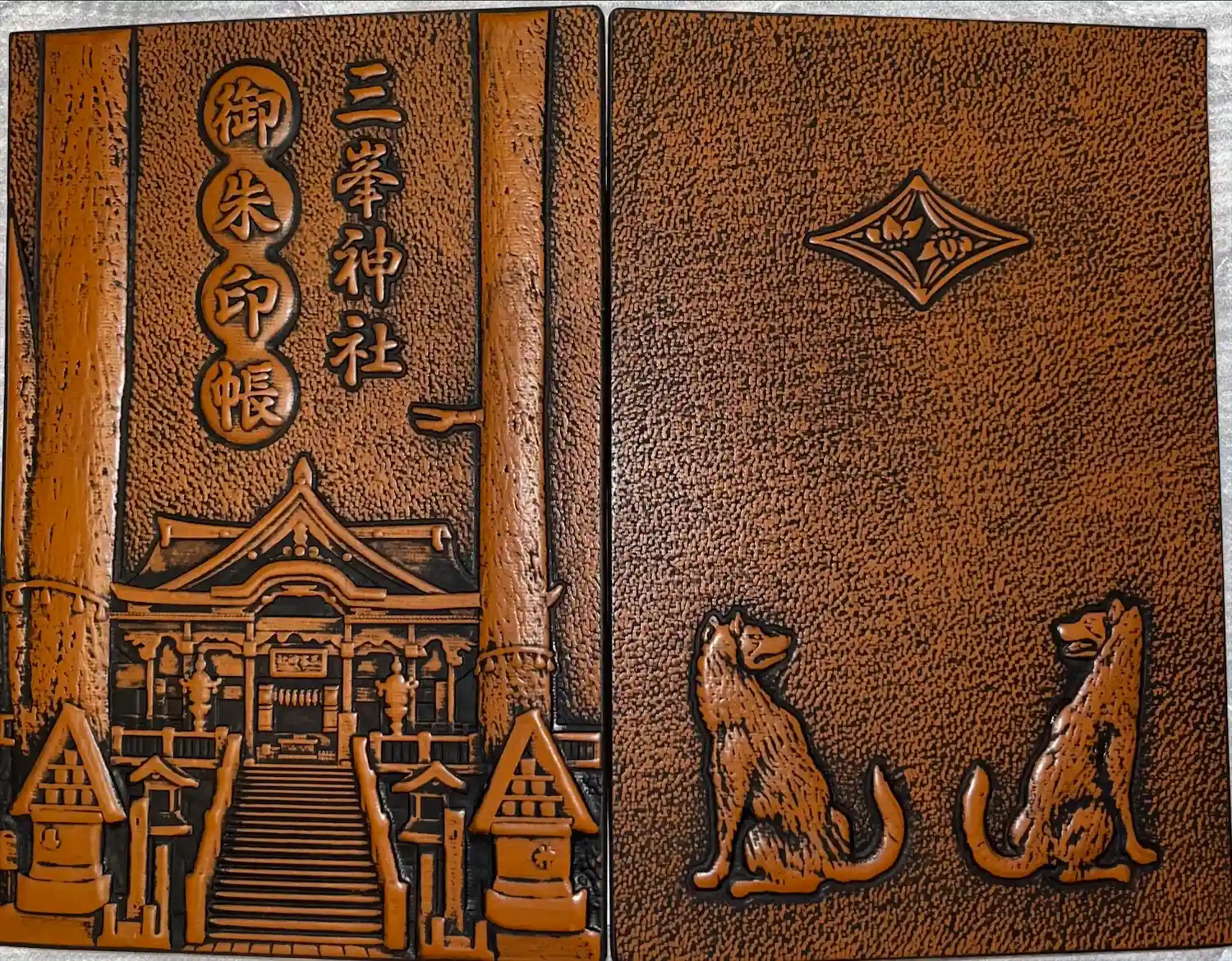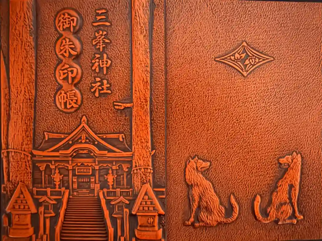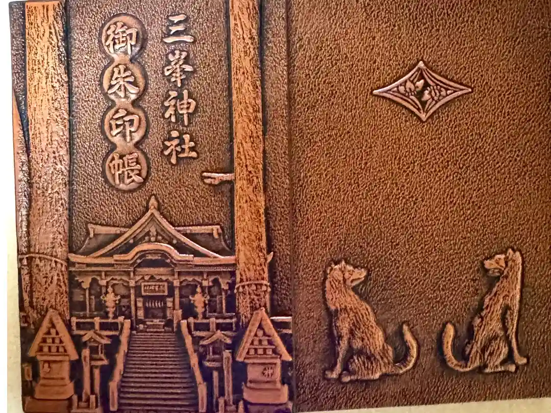 本殿や狼、菖蒲菱がほどこされた、木彫り調の御朱印帳。