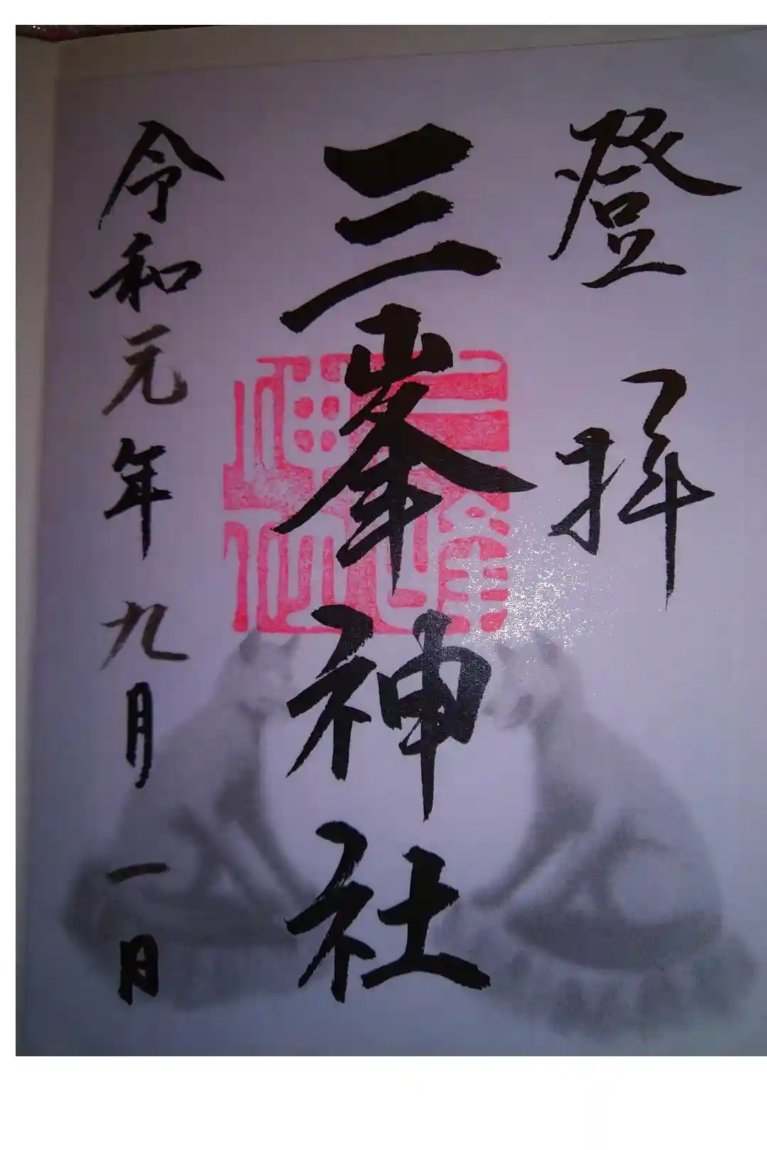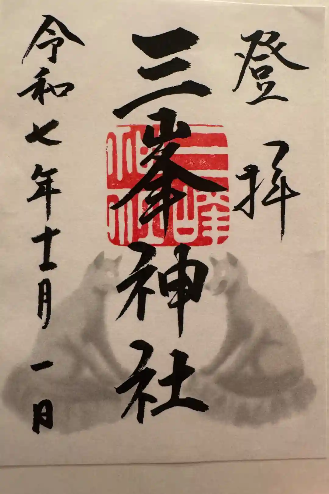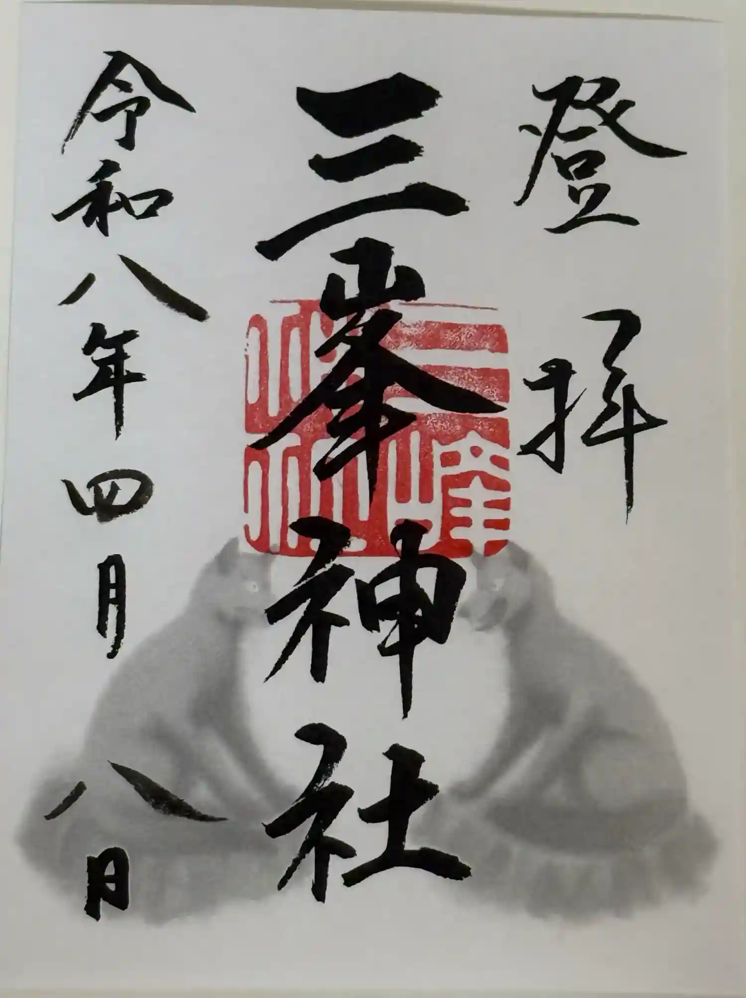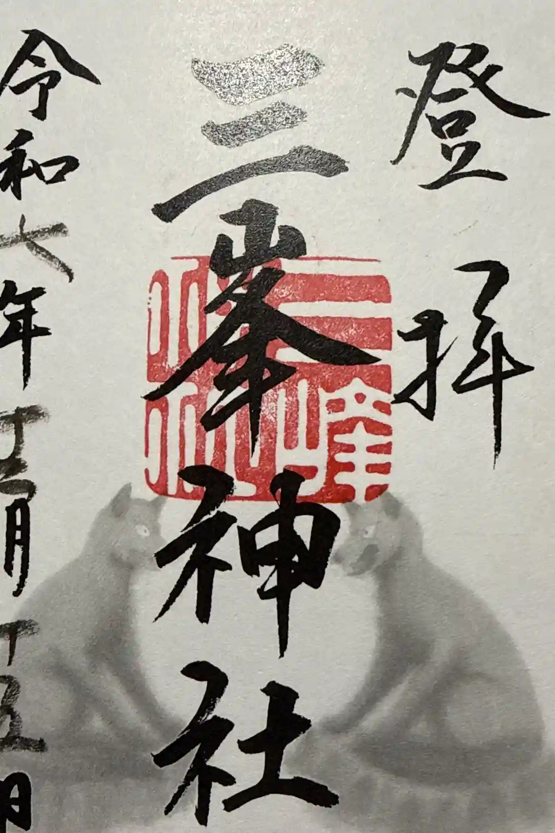 三峯神社は山上に位置することから、右上には『登拝』の文字が書かれています。アヤメとオオカミが描かれたアートな御朱印も書き置きでいただけます。 | |||