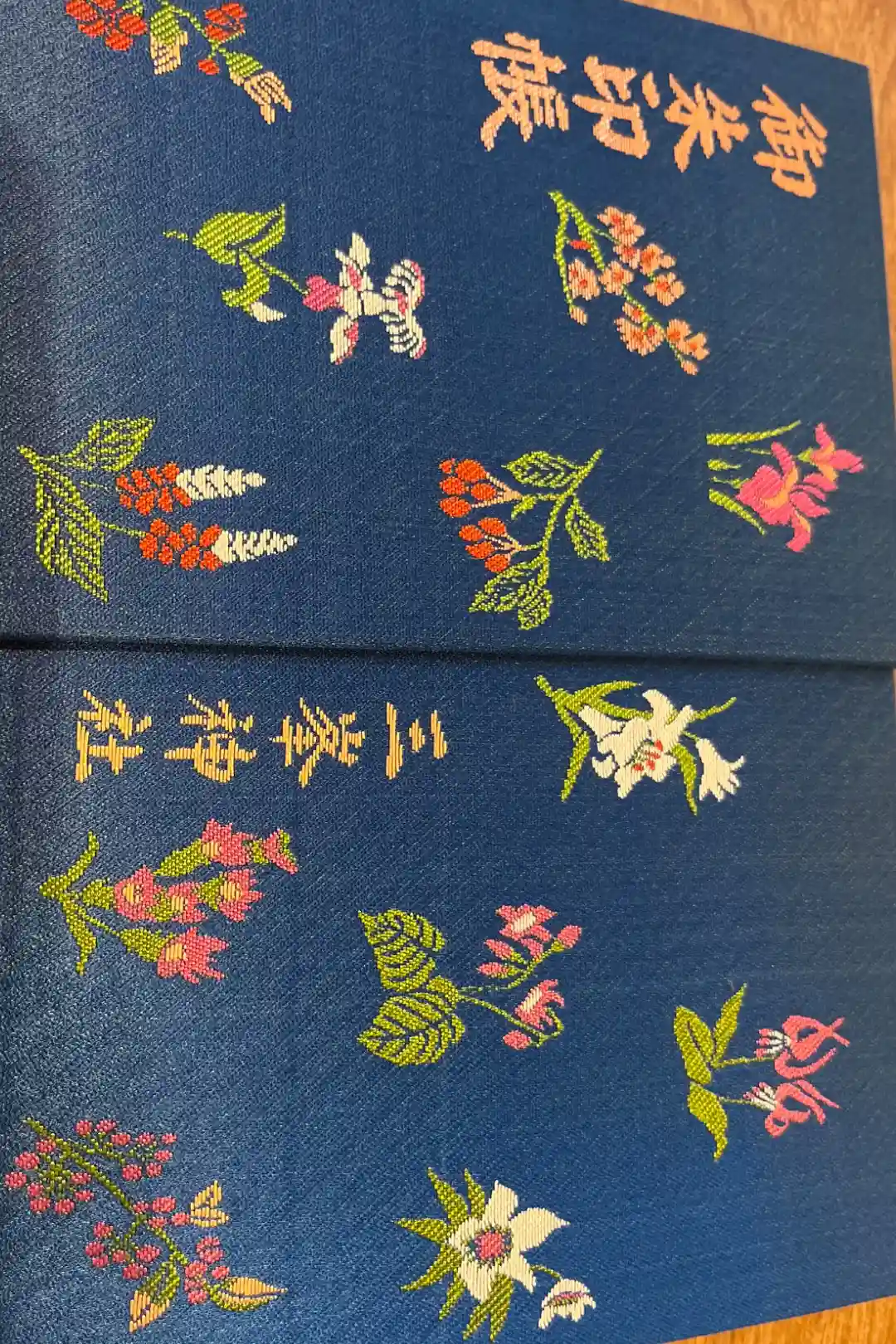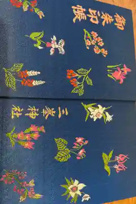 紺地に秩父山中に咲く四季の花々が刺繍された美しいデザインです。
