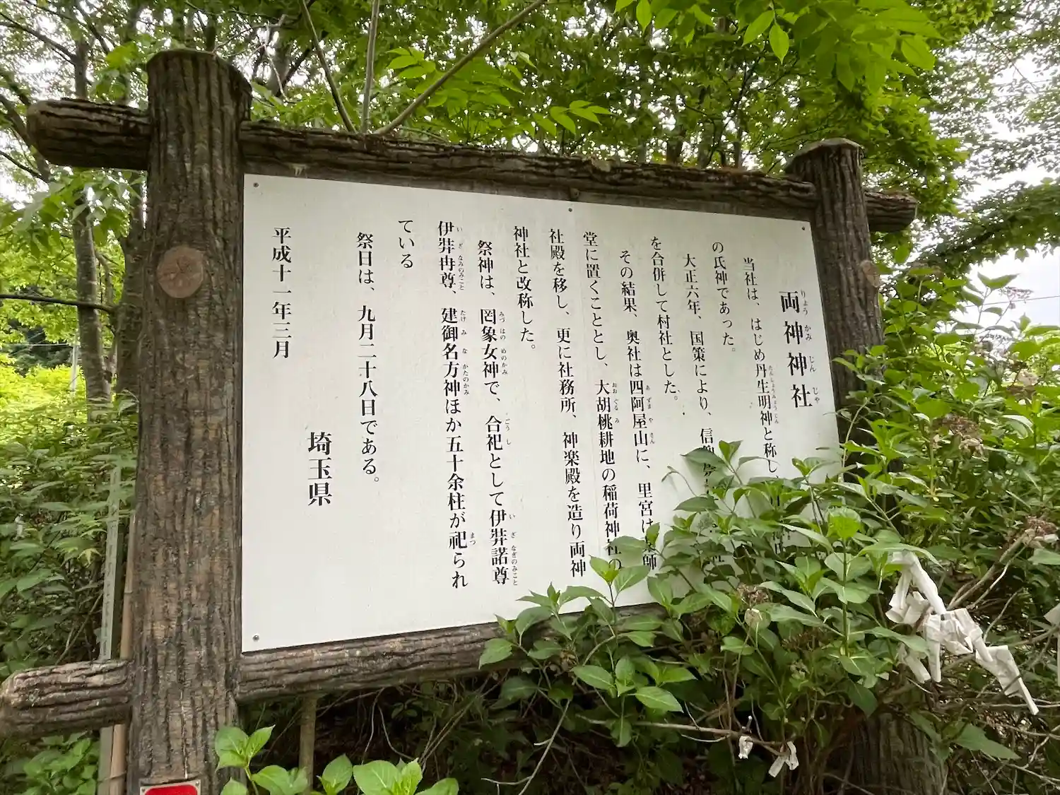 その結果、奥社は四阿屋山に、里宮は薬師堂に置くこととし、大胡桃耕地の稲荷神社の社殿を移し、更に社務所、神楽殿を造り両神神社と改称した。