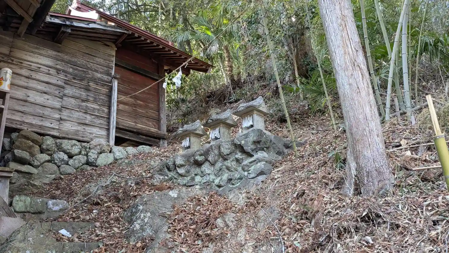 集落の中心にある小さい山のような場所に建てられています。この地域で行われる塚越の花まつりはお釈迦様の誕生日の1ヶ月後に行われるお祭りでこの熊野神社から花びらを撒きながら米山薬師堂まで練り歩く江戸時代から続く神仏習合の行事です。