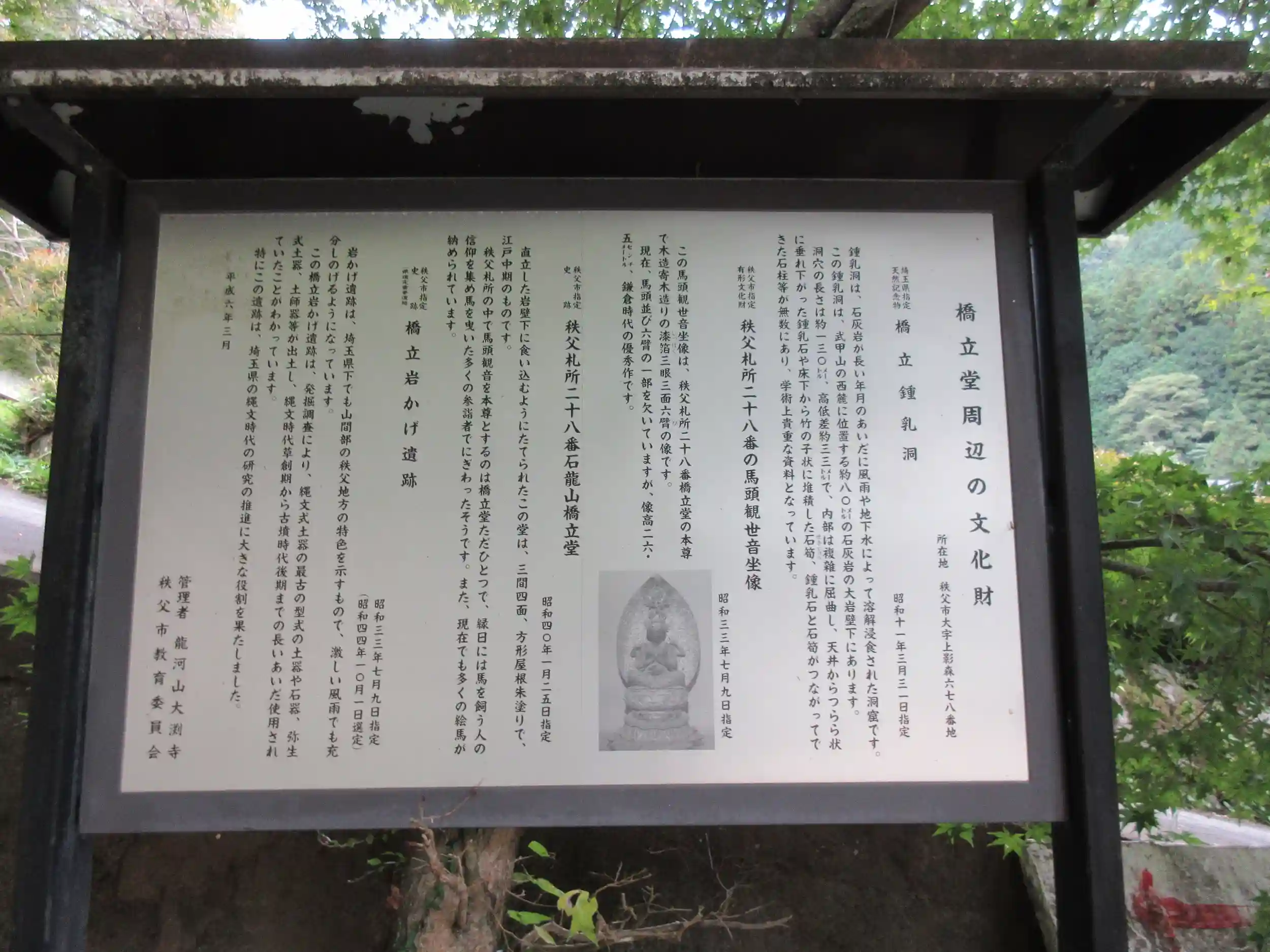 札所28番、橋立堂、秩父札所唯一の馬頭観世音が祀られており、交通安全祈願に訪れる人が多いです。高さ80mの岩山を背にしており、一帯には縄文人が住んでいたという岩陰遺跡からは古代ロマンが偲ばれます。 また奥の院は橋立鍾乳洞で古くは胎内くぐりの霊場でありましたが、現在は神秘的な別世界を観光鍾乳洞として楽しめます。