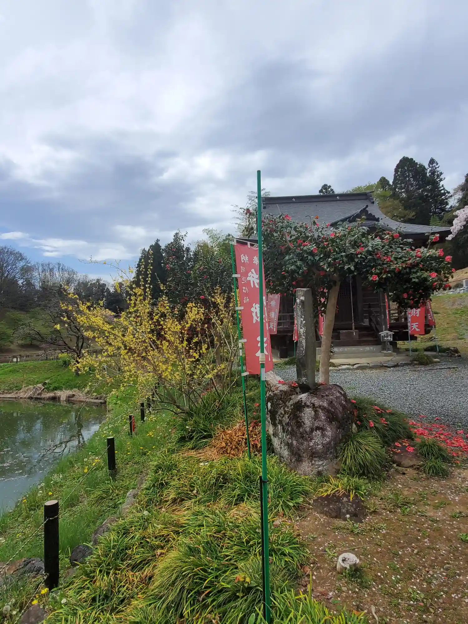 池の堤を通ってお寺へ