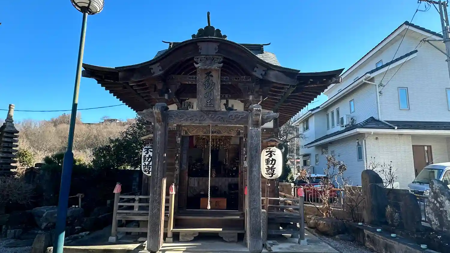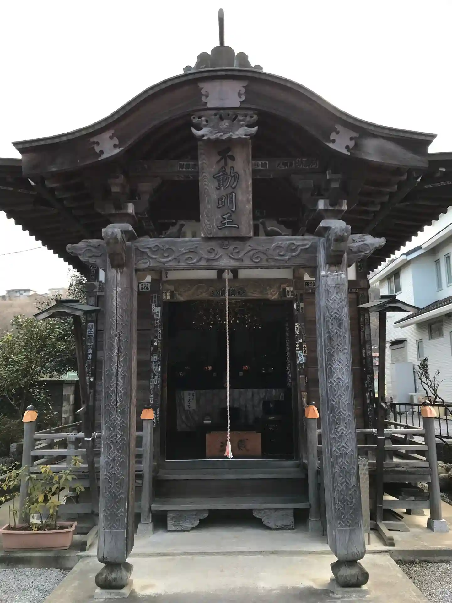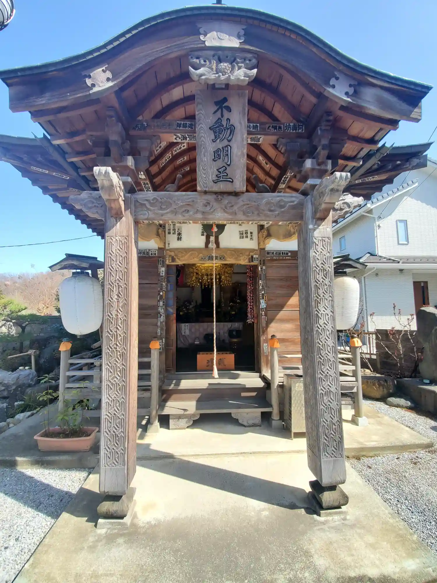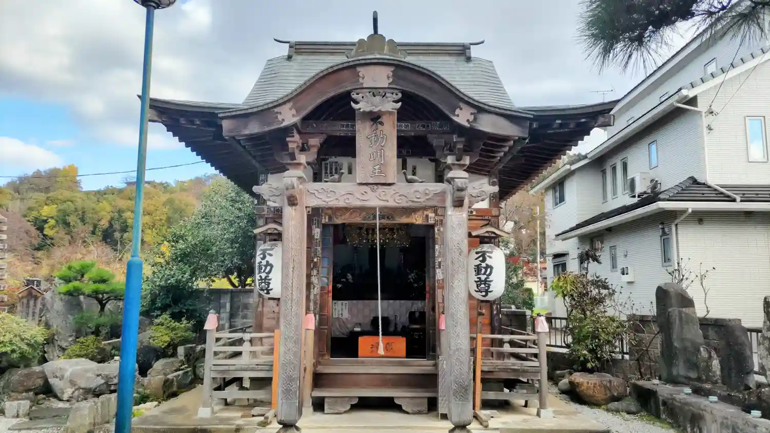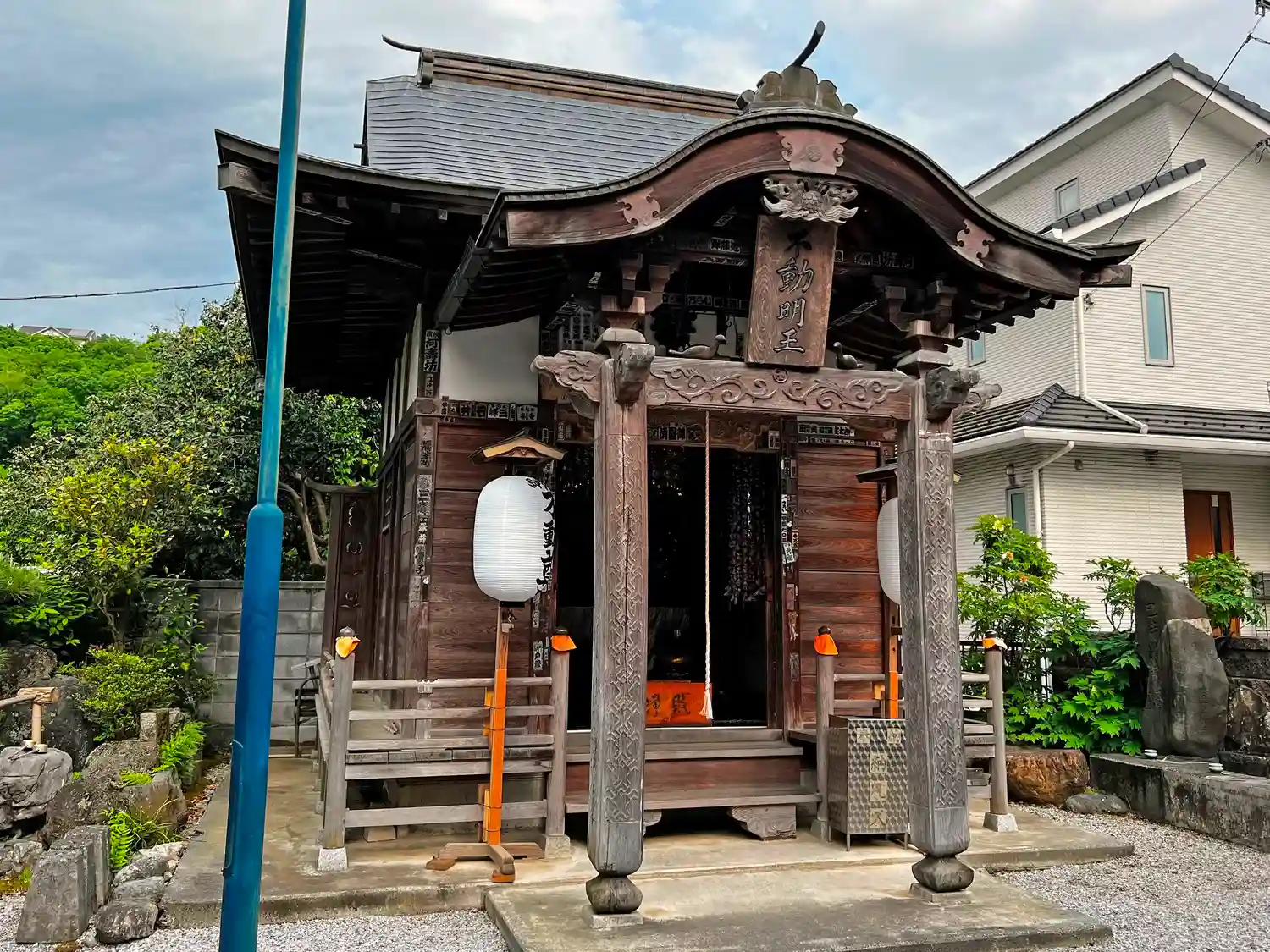境内南東部にある<不動堂>。建物は小さいが、入口の柱に凝った彫刻が入っている。