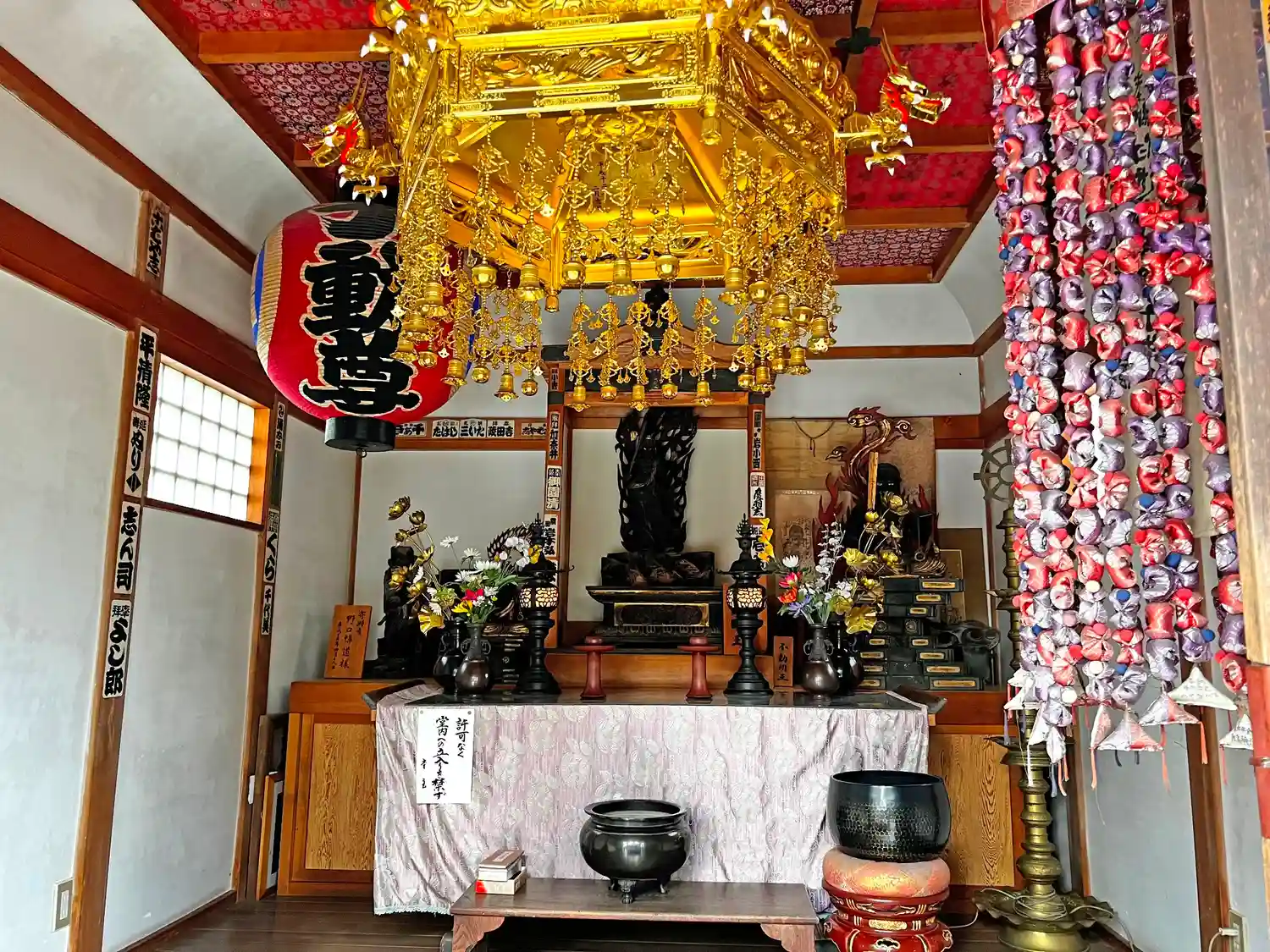 本堂前左側にある小さな祠の内部。中央には可愛らしいサイズの仏像。