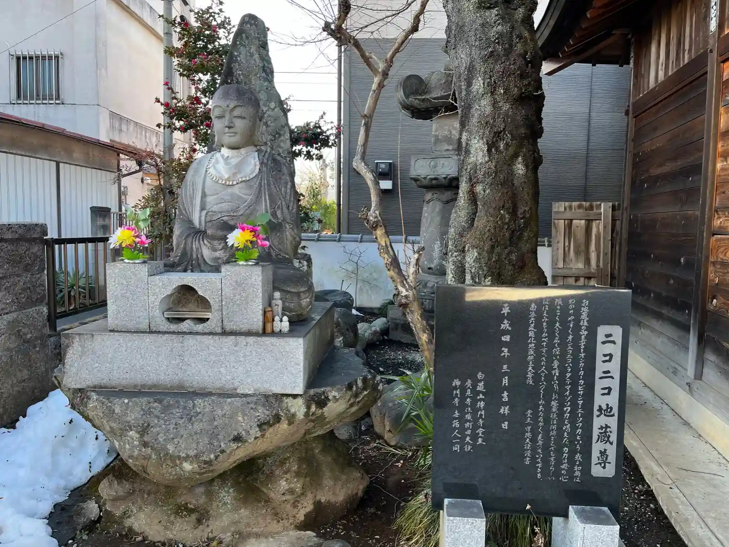境内南西部、短い参道を挟んで不動堂の対面にある<ニコニコ地蔵尊>。親しみやすいネーミング。