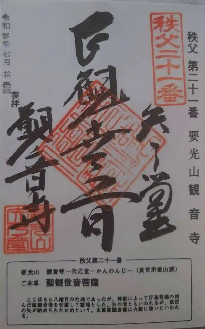 秩父三十四箇所 第二十一番札所の観音寺で御朱印を頂きました。