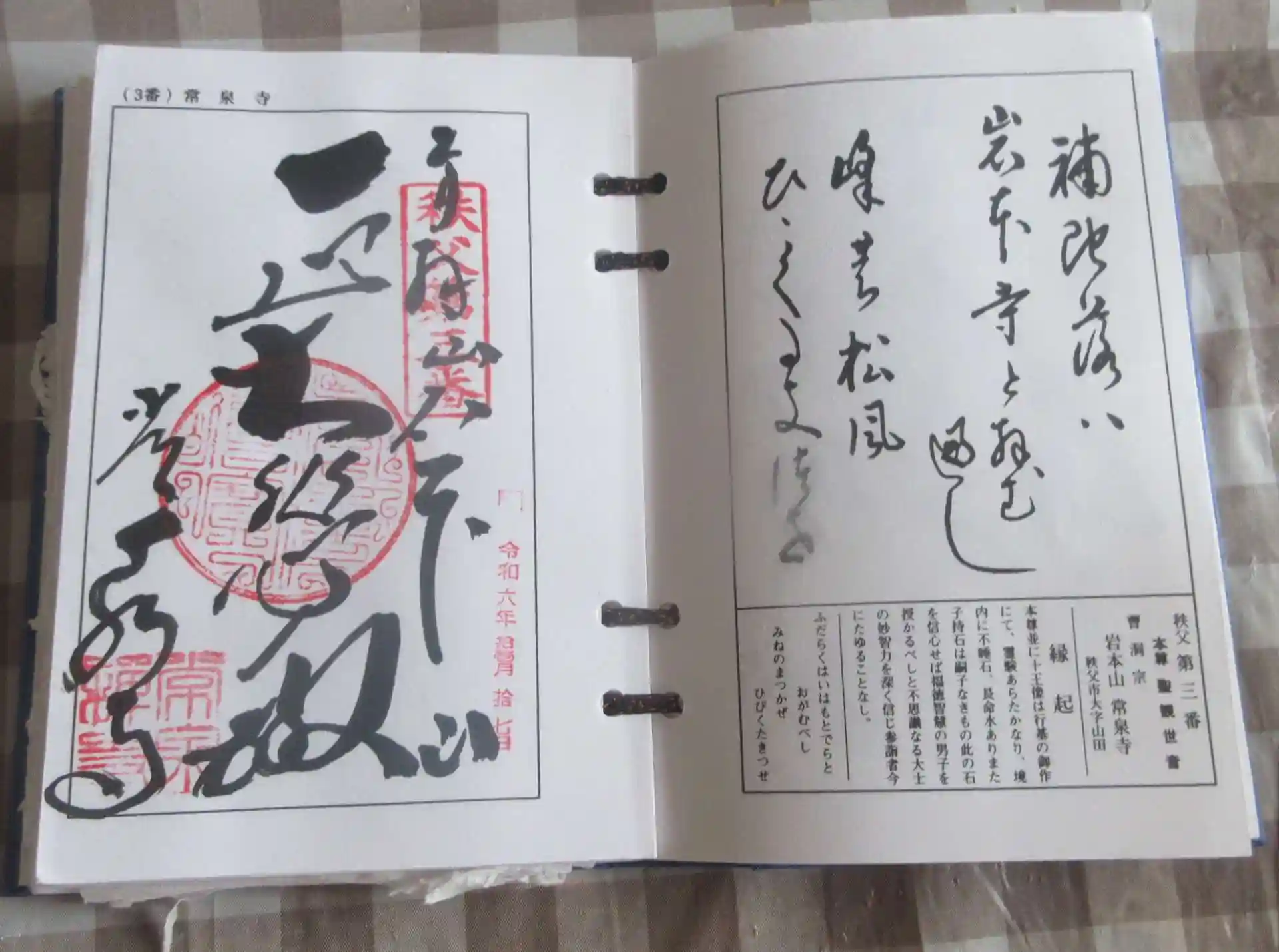 秩父札所3番・常泉寺は、1234年(文暦元年)3月18日、覚了和尚の開山と伝わり、当初は高篠山の中腹の岩窟に所在したと推定されている。その後、当地の名主堀内、家が現在地に建立し札所を移したと伝わっている。1847年(弘化4年)の火災で本堂が焼失したが、1858年(安政5年)に再建されている。また、本堂左手の観音堂は、1870年(明治3年)に秩父神社境内にあった蔵福寺の薬師堂を移築したものであり、宝形屋根、三間四面の構造である。
