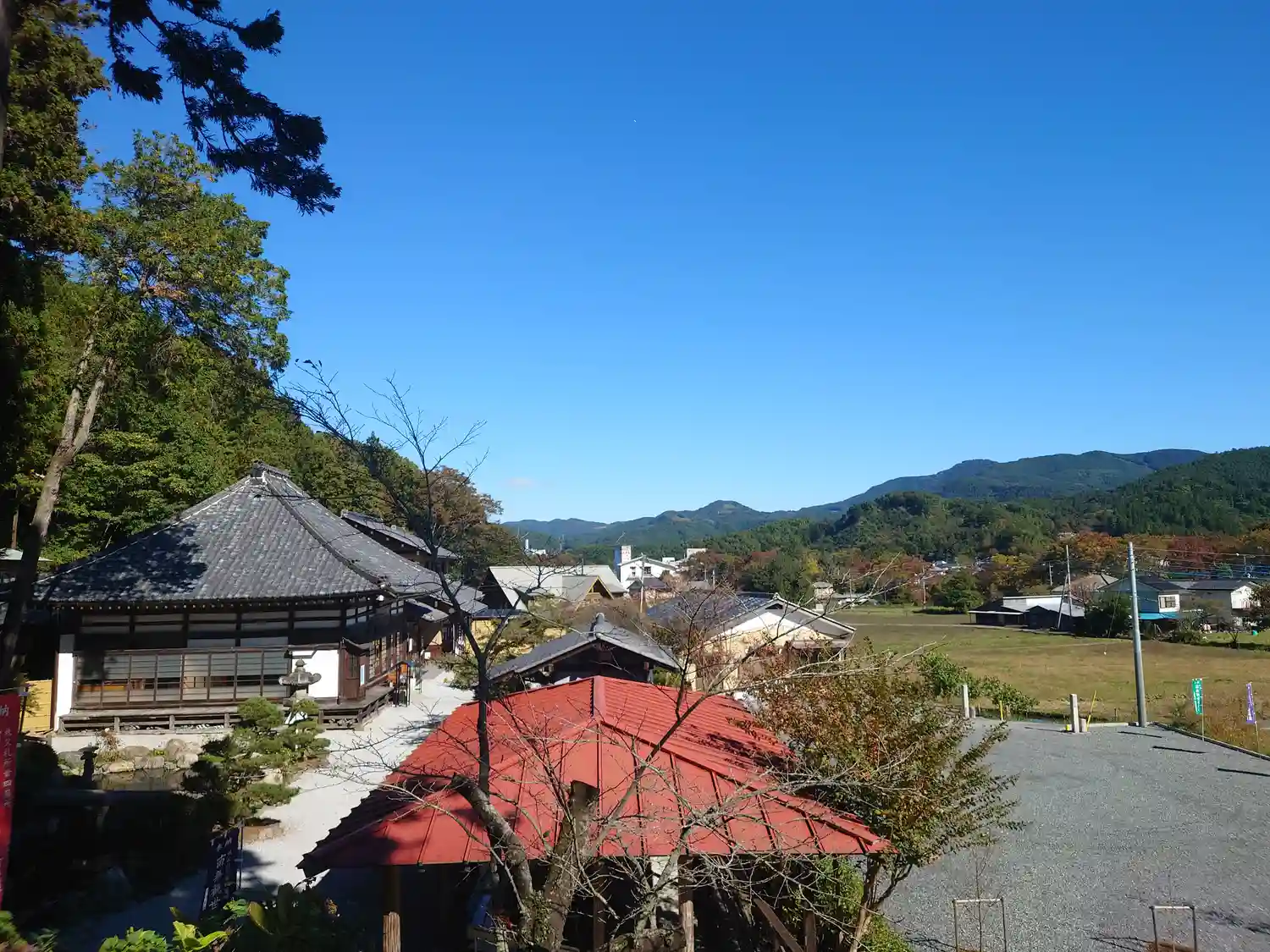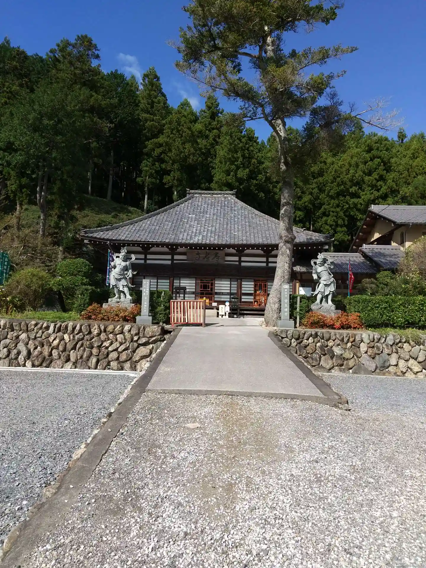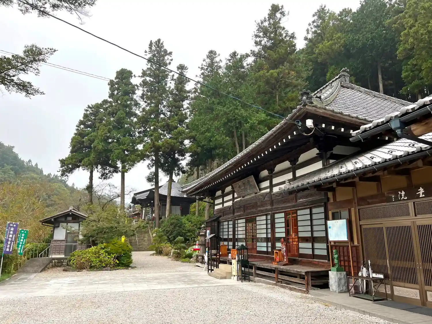 少し遠方から、正面に本堂、左手少し上がったところに観音堂