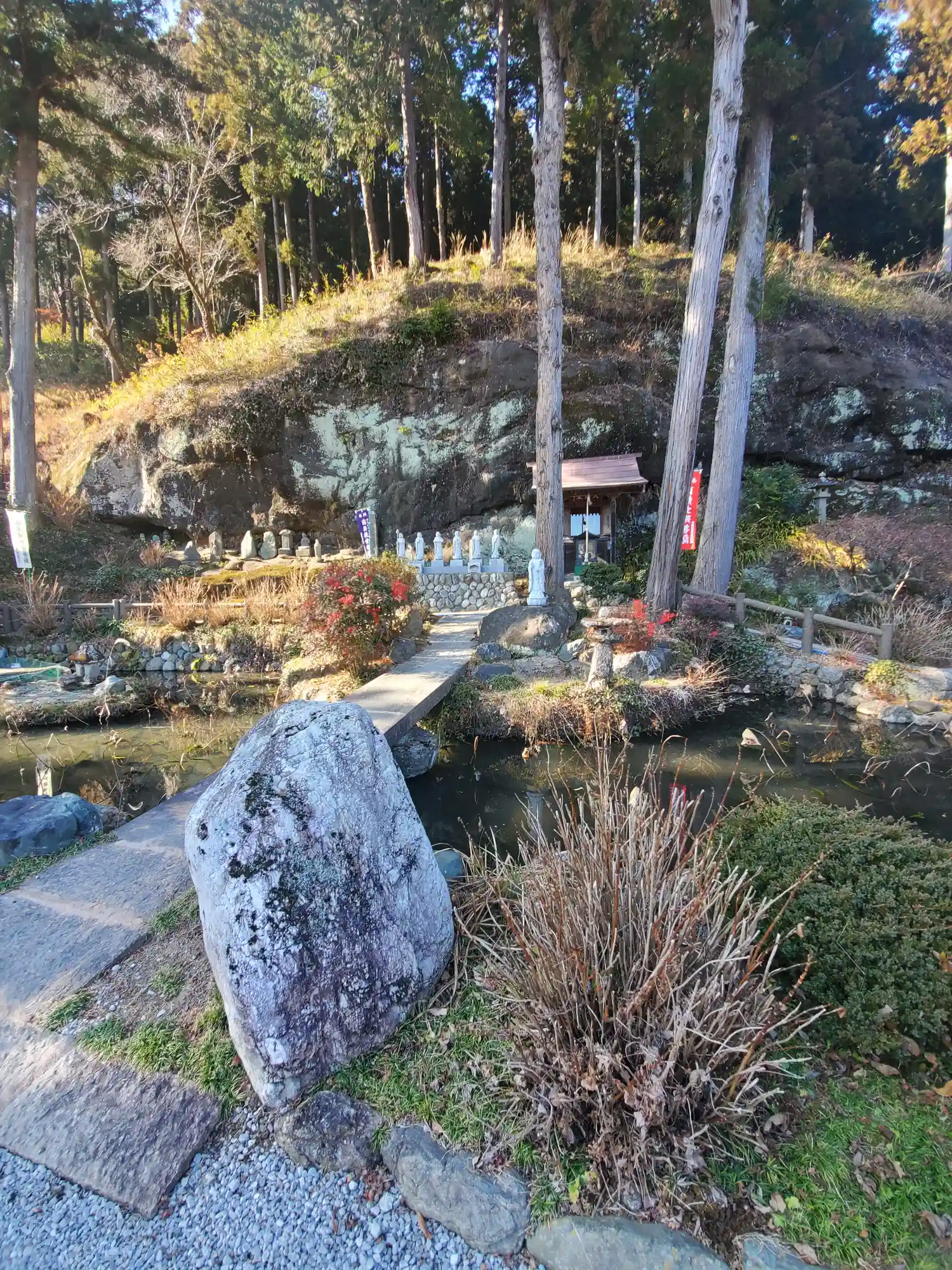 低い山の中腹にあるような感じで高い木や自然の岩をいかして仏像が並ん…