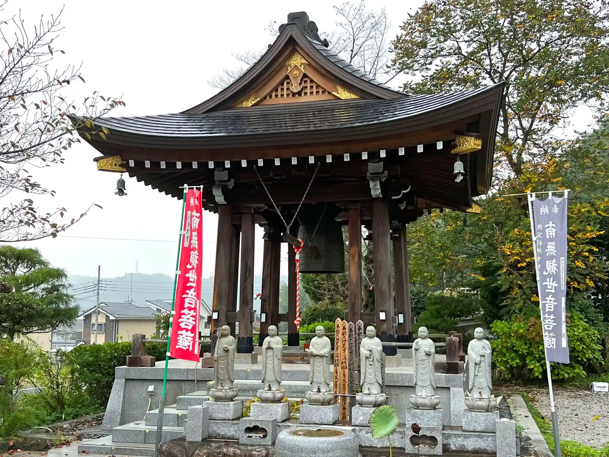 参道の左手、少し離れたところにある<鐘楼>。手前は<六地蔵>。