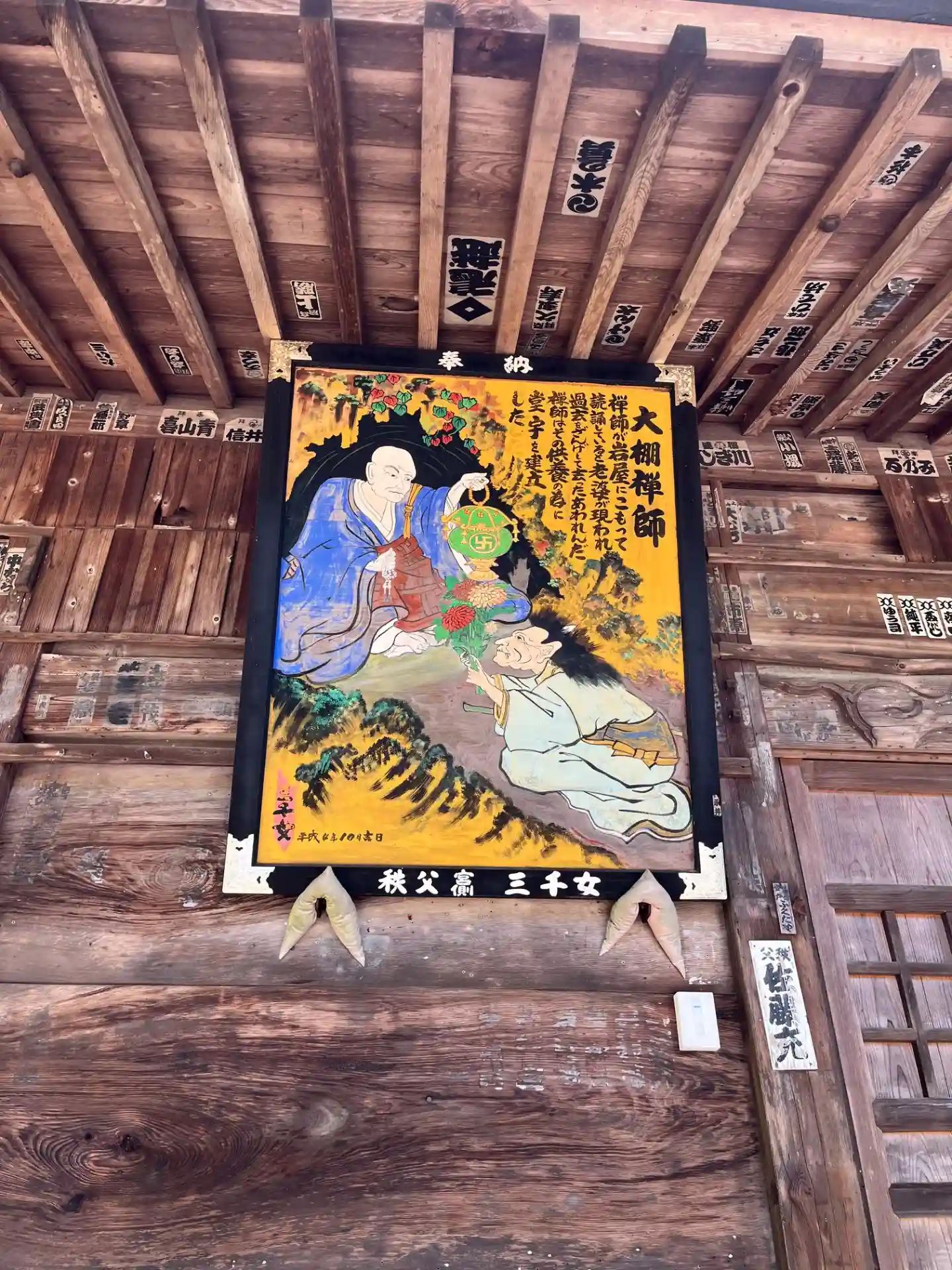 <本堂>の横に飾られている奉納額。江戸っぽい絵と由緒が書いてある。
