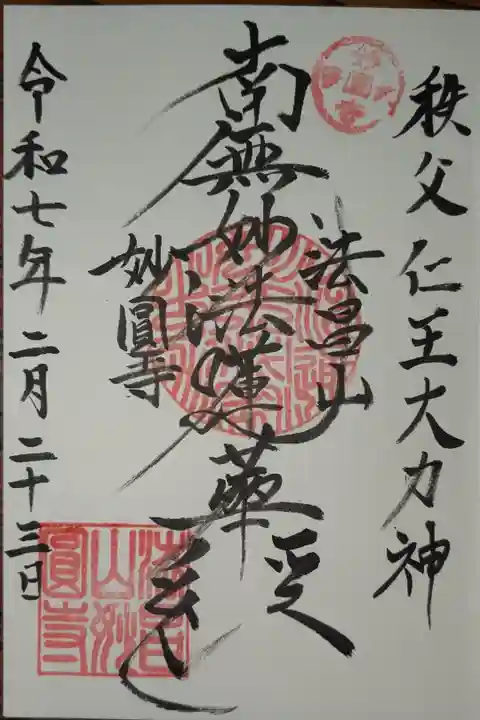 禅宗の霊場寺院が多い秩父市で唯一の日蓮宗のお寺です。参道は長い階段ですが車で上がれる道もあります。参道の先には立派な仁王門。飾られている沢山の草鞋は願掛けの為に奉納されたもので中には明治時代の物もあるんだとか。境内には他に鬼子母尊神の御堂と妙見稲荷が祀られています。本堂に参拝した後で寺務所で御首題を頂きました。押されている古銭の印は秩父市内に和銅遺跡があるからでしょうか?