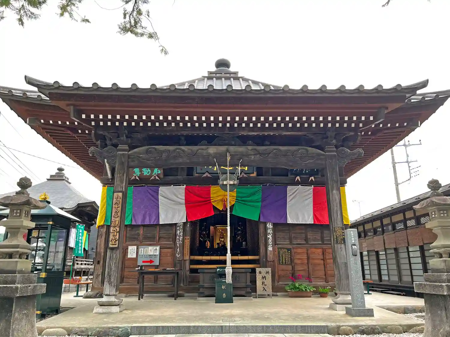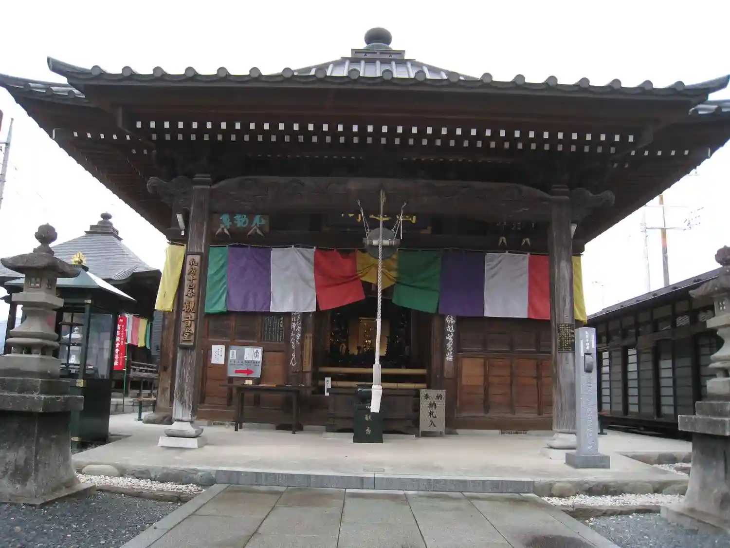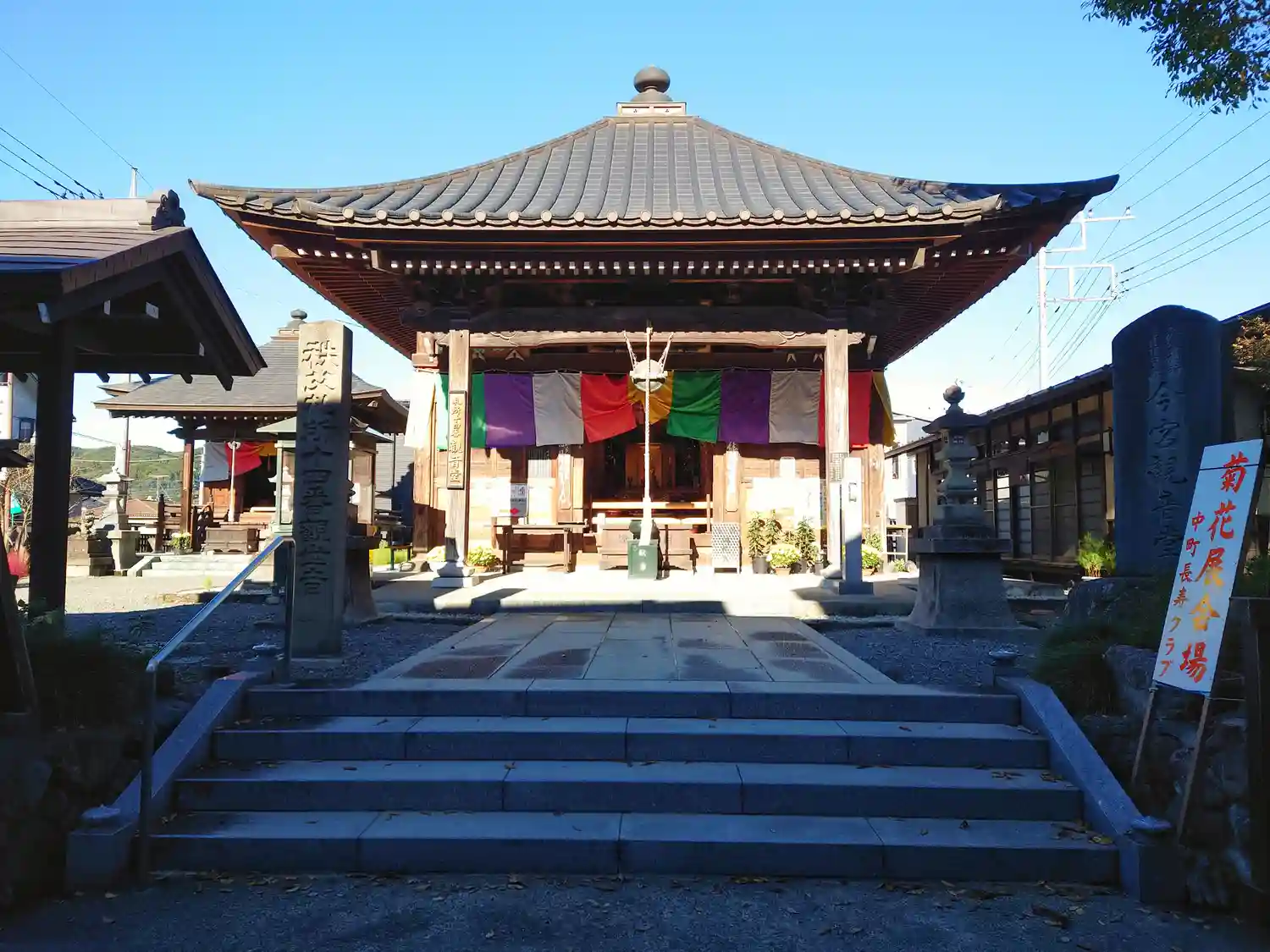 <観音堂>全景。方三間の堂宇。五色の寺院幕で引き締まった印象。(o^―^o)