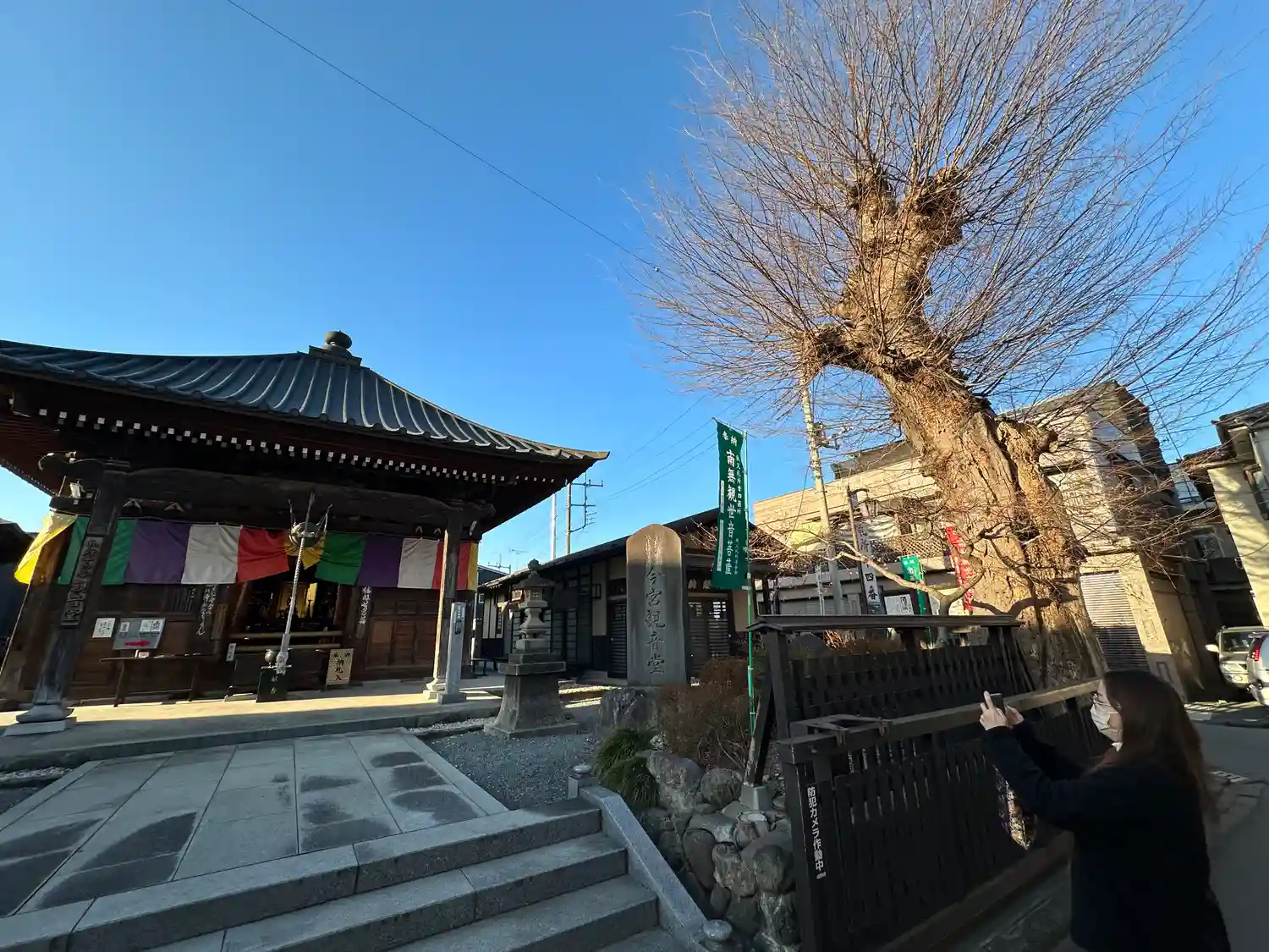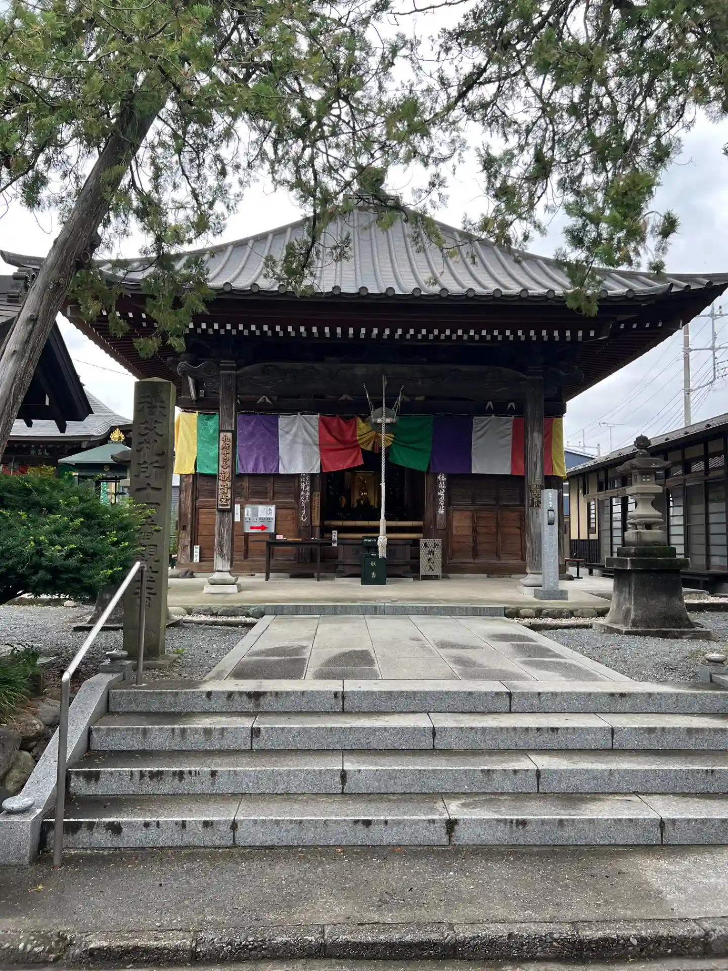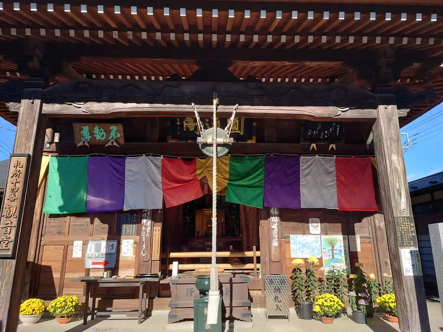 <観音堂>全景。方三間の堂宇。五色の寺院幕で引き締まった印象。(o^―^o)
