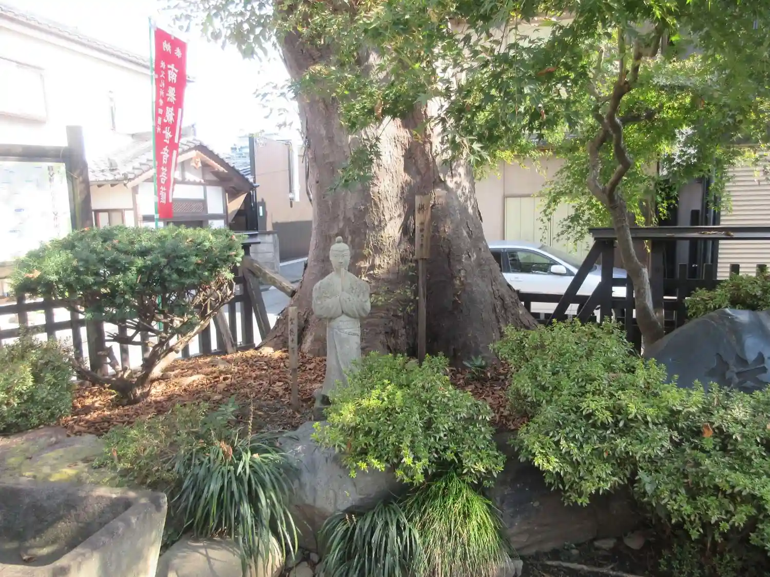 納経所の前にある<聖徳大師像>と、推定樹齢500年の欅(けやき)の巨木。