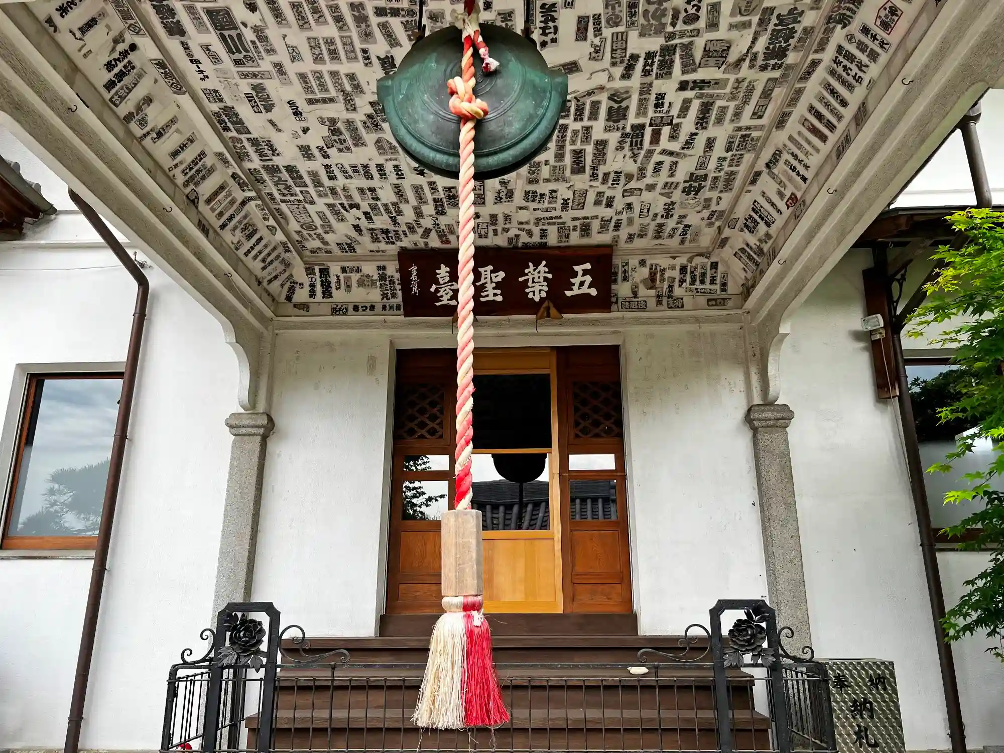 <本堂>正面。上部には「五葉聖臺」と書かれた扁額が掛かる。向拝の天井には無数の千社札。
