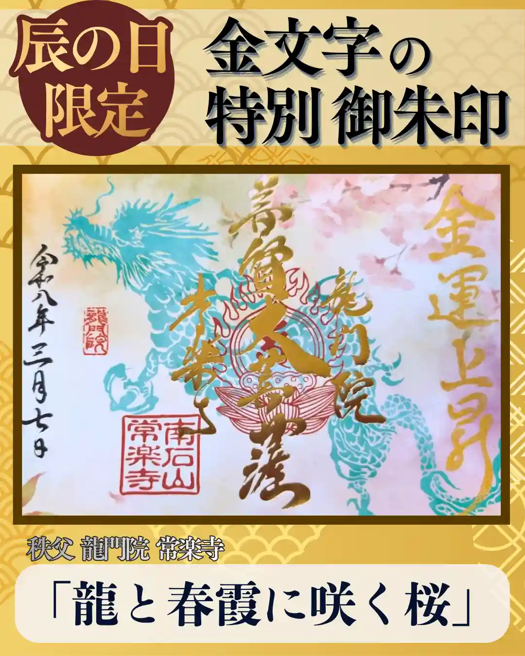 龍門院常楽寺では以下の御朱印を頒布しております。 ◆通年頒布している御朱印 ◆月替わりの《龍の特別…