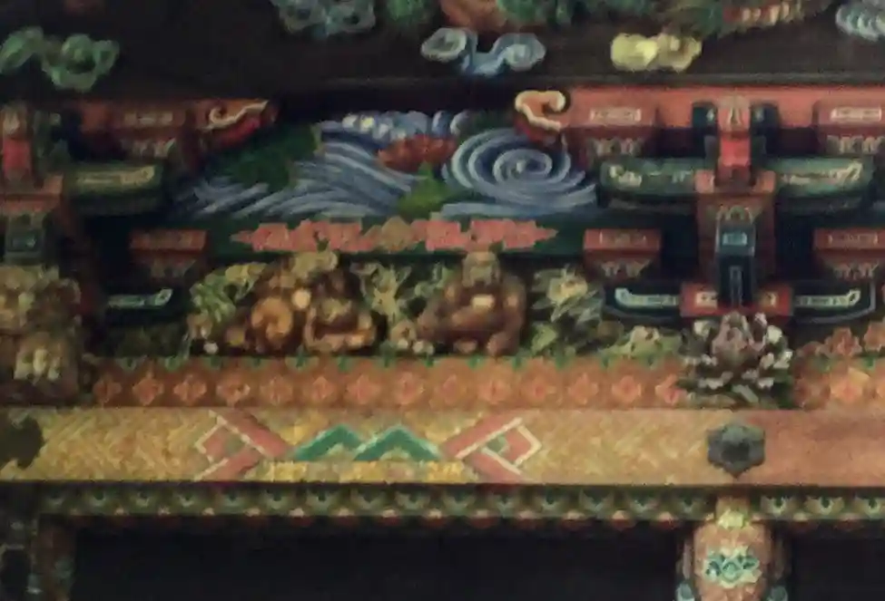 本殿左側の彫刻。写真左側に<お元気三猿>の彫刻がある。