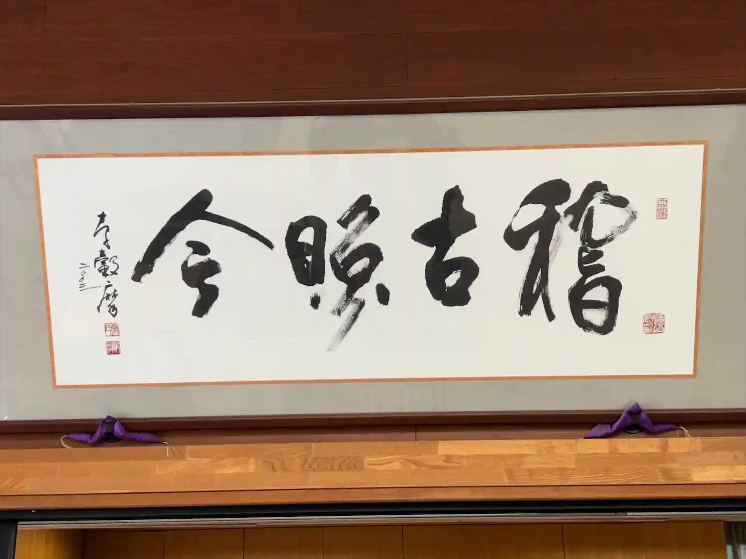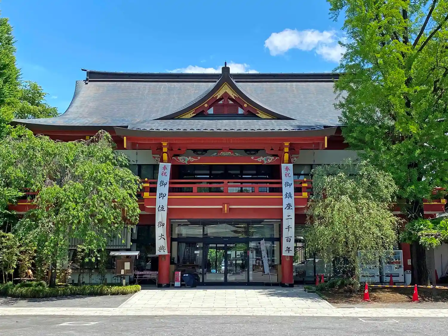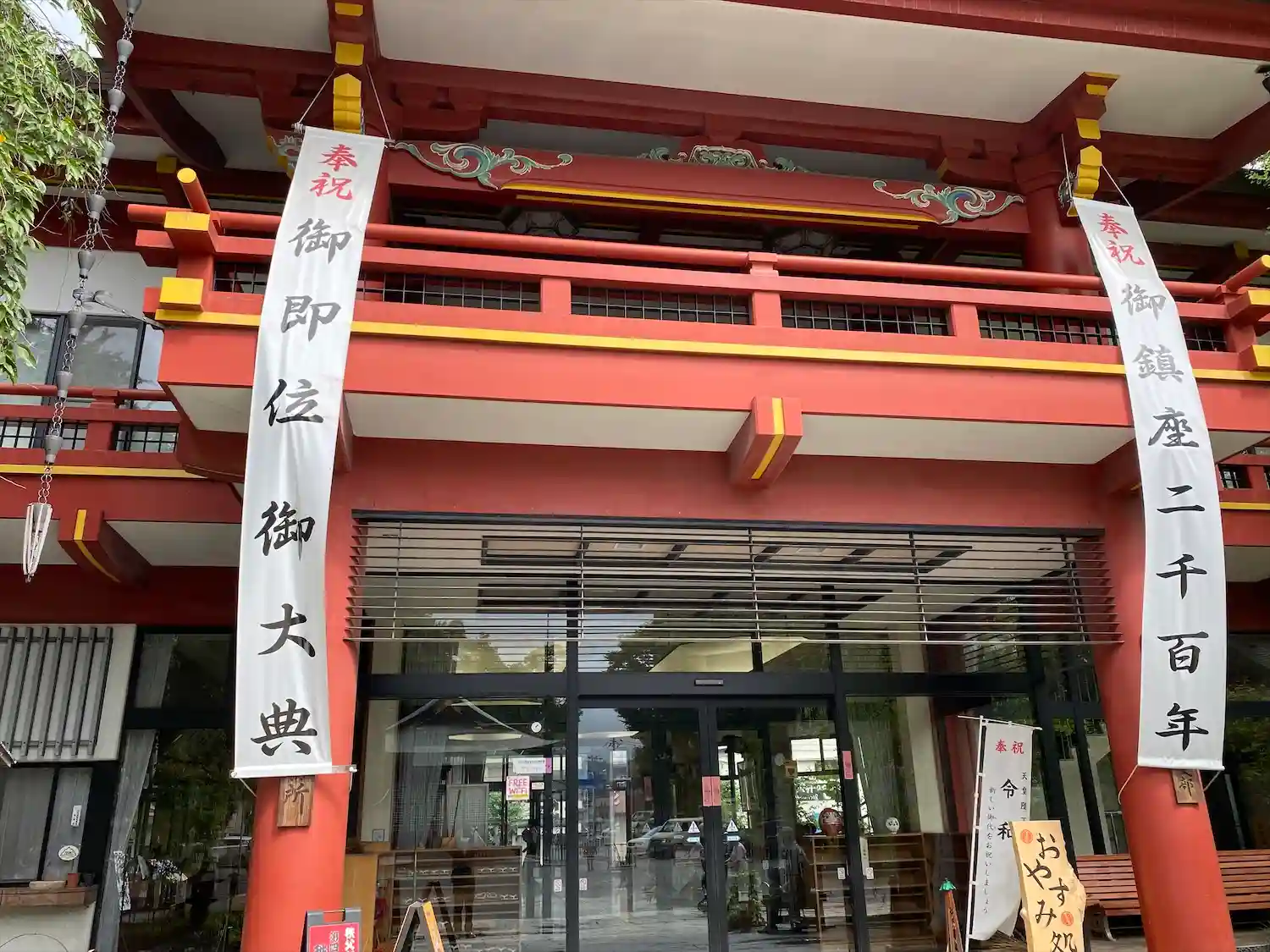 天皇陛下の即位のお祝いの垂れ幕のある社務所
