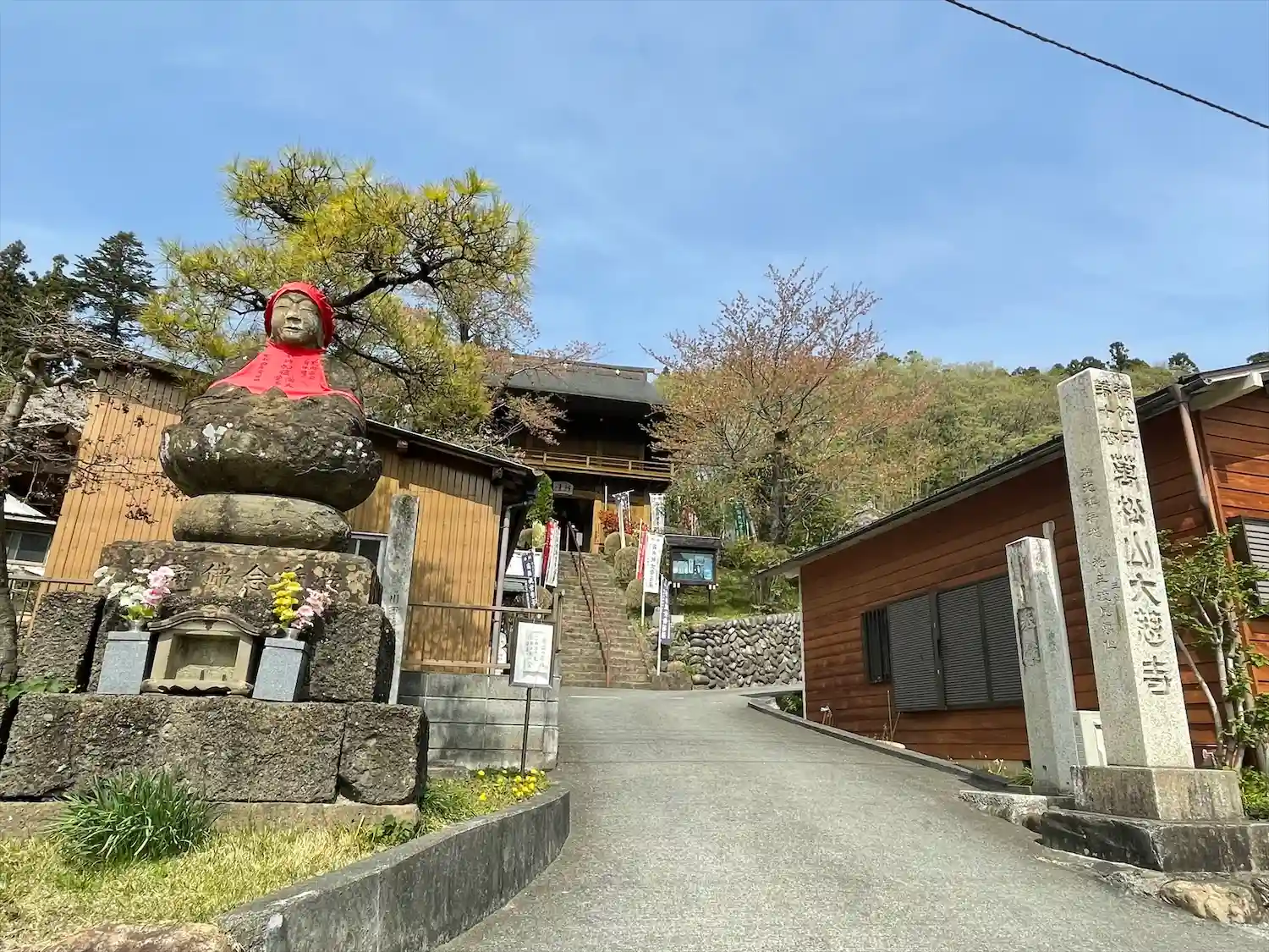 赤い頭巾を被った地蔵様が見えてきたら参道の入口です。