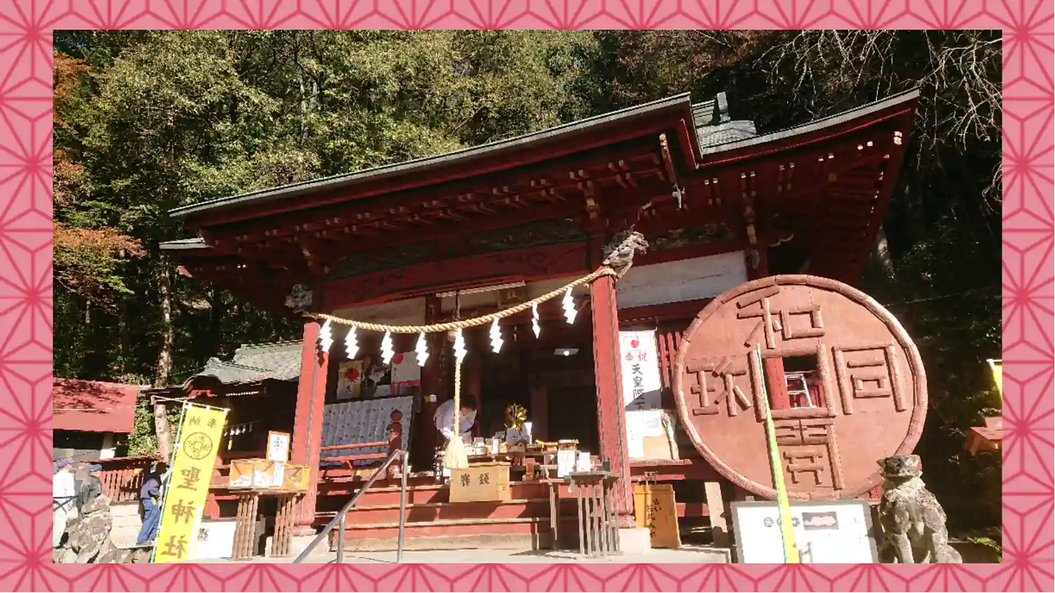 拝殿右手には、直径3メートルの巨大な和同開珎のモニュメントが置かれています。